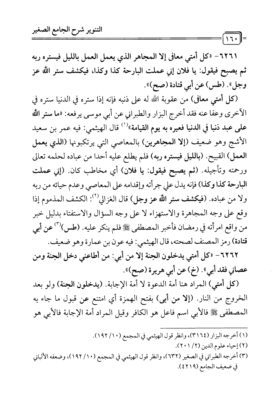 6261 - "كل أمتي معافى إلا المجاهر الذي يعمل العمل بالليل فيستره ربه ثم يصبح فيقول: يا فلان إني عملت البارحة كذا وكذا، فيكشف ستر الله عز وجل". (طس) عن أبي قتادة (صح) ".