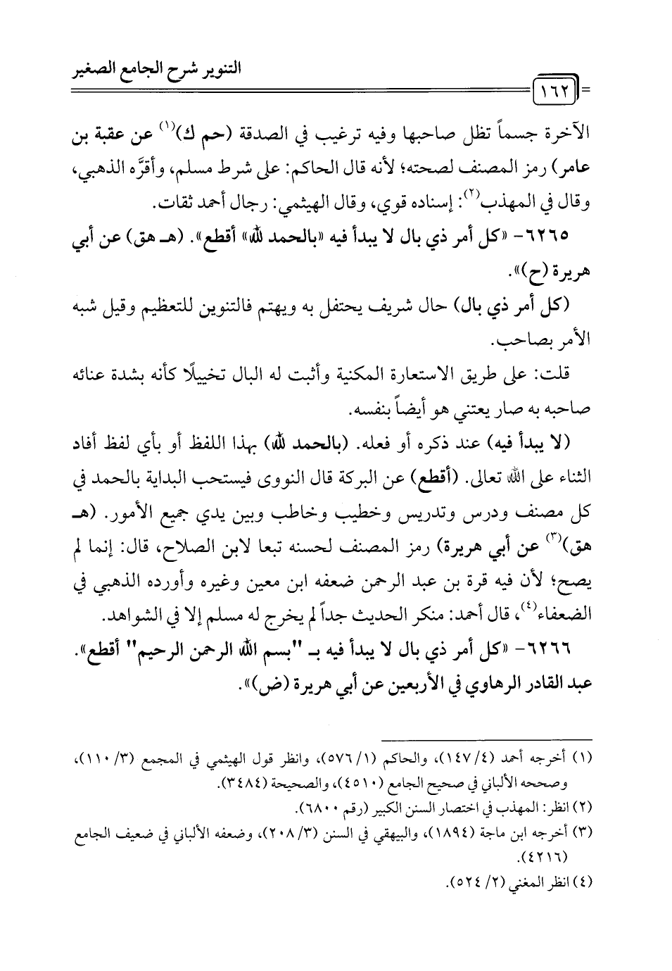 6265 - "كل أمر ذي بال لا يبدأ فيه "بالحمد لله" أقطع". (هـ هق) عن أبي هريرة (ح) ".