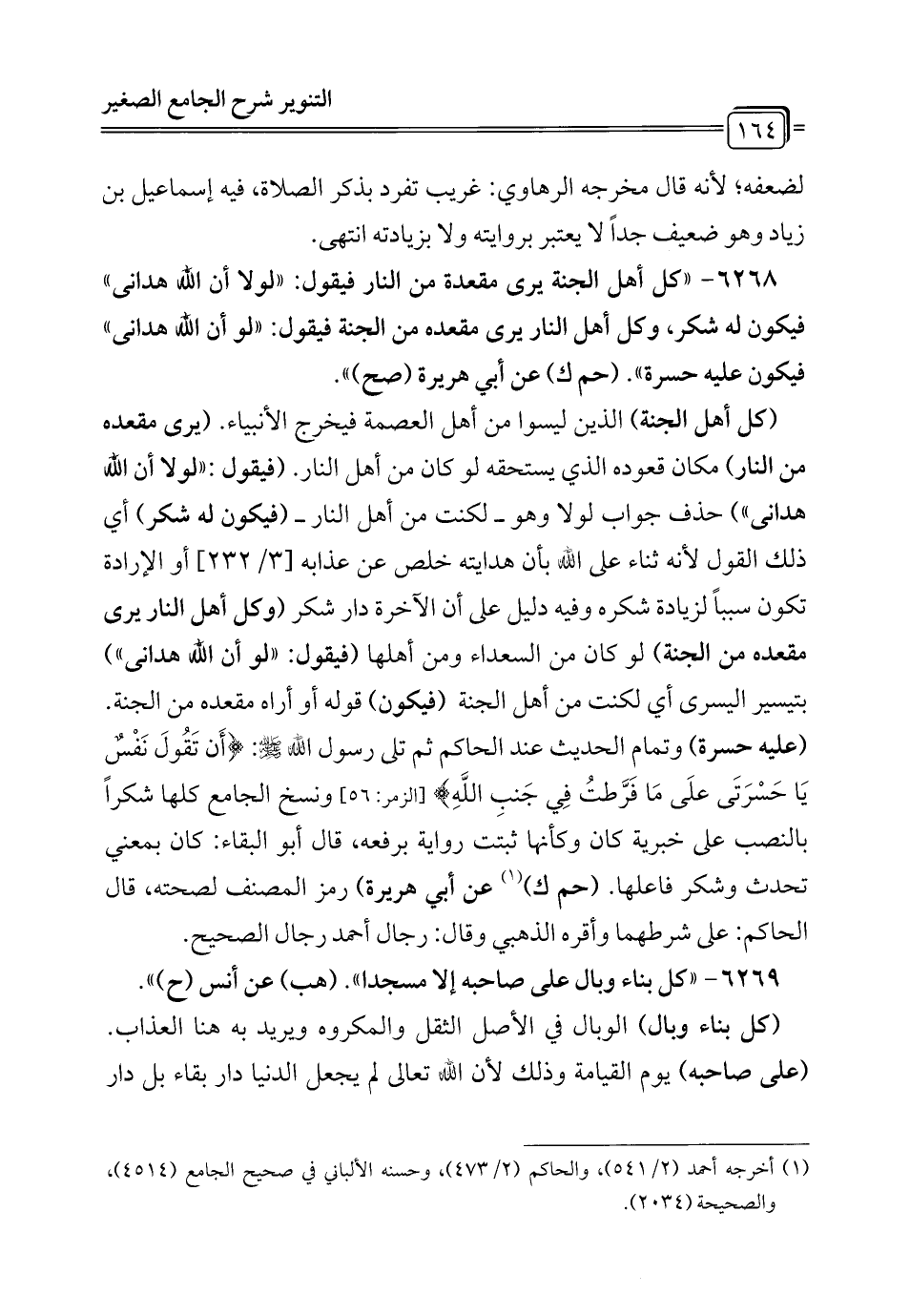(كل أهل الجنة) الذين ليسوا من أهل العصمة فيخرج الأنبياء. (يرى مقعده من النار) مكان قعوده الذي يستحقه لو كان من أهل النار. (فيقول: "لولا أن الله هدانى") حذف جواب لولا وهو -لكنت من أهل النار- (فيكون له شكر) أي ذلك القول لأنه ثناء على الله بأن هدايته خلص عن عذابه [3/ 232] أو الإرادة تكون سبباً لزيادة شكره وفيه دليل على أن الآخرة دار شكر (وكل أهل النار يرى مقعده من الجنة) لو كان من السعداء ومن أهلها (فيقول: "لو أن الله هدانى") بتيسير اليسرى أي لكنت من أهل الجنة (فيكون) قوله أو أراه مقعده من الجنة. (عليه حسرة) وتمام الحديث عند الحاكم ثم تلى رسول الله - صلى الله عليه وسلم -: {أَنْ تَقُولَ نَفْسٌ يَا حَسْرَتَا عَلَى مَا فَرَّطْتُ فِي جَنْبِ اللَّهِ} [الزمر: 56] ونسخ الجامع كلها شكراً بالنصب على خبرية كان وكأنها ثبتت رواية برفعه, قال أبو البقاء: كان بمعنى تحدث وشكر فاعلها. (حم ك) (¬1) عن أبي هريرة) رمز المصنف لصحته، قال الحاكم: على شرطهما وأقره الذهبي وقال: رجال أحمد رجال الصحيح.