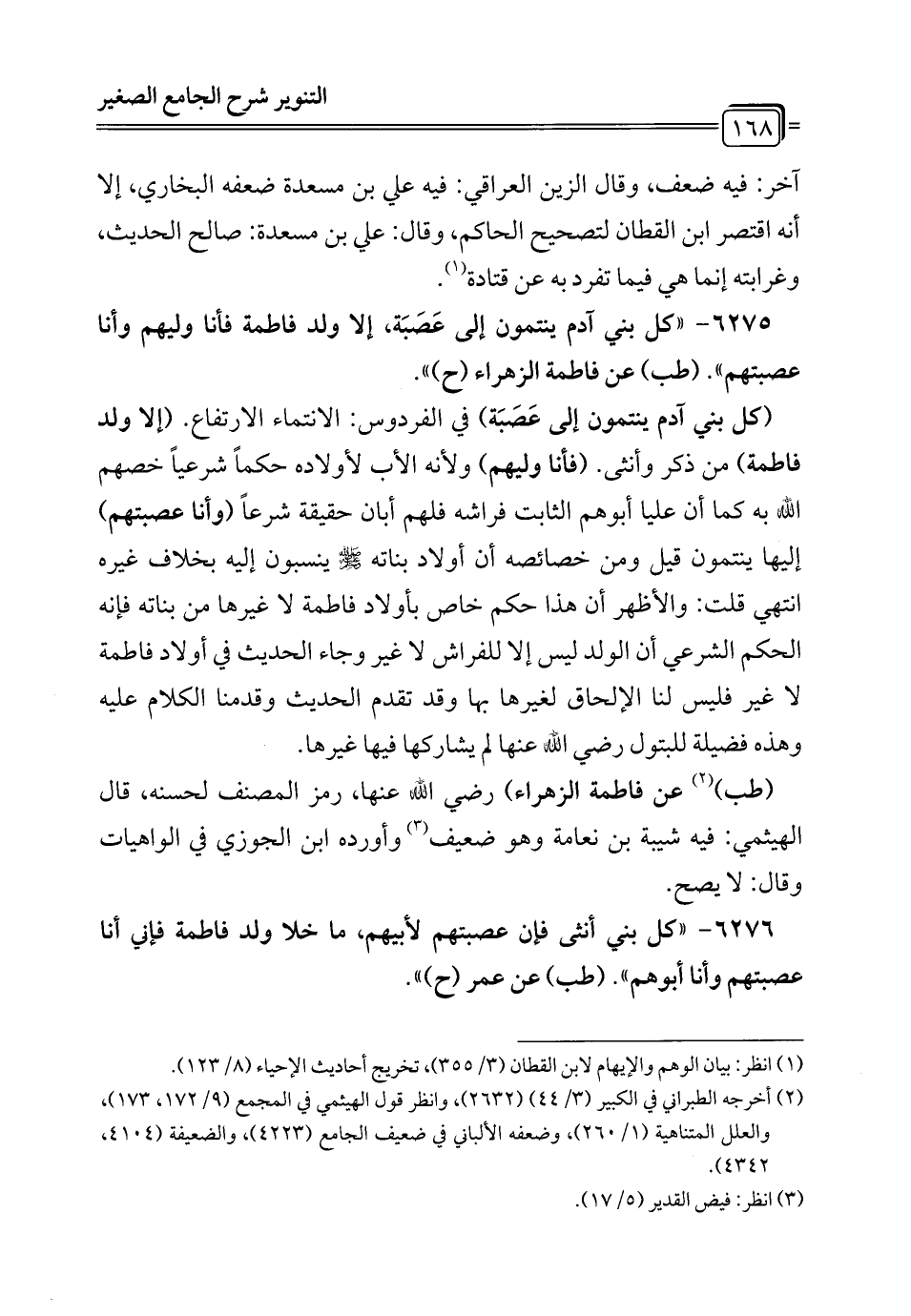 6275 - "كل بني آدم ينتمون إلى عَصَبَة, إلا ولد فاطمة فأنا وليهم وأنا عصبتهم". (طب) عن فاطمة الزهراء (ح) ".