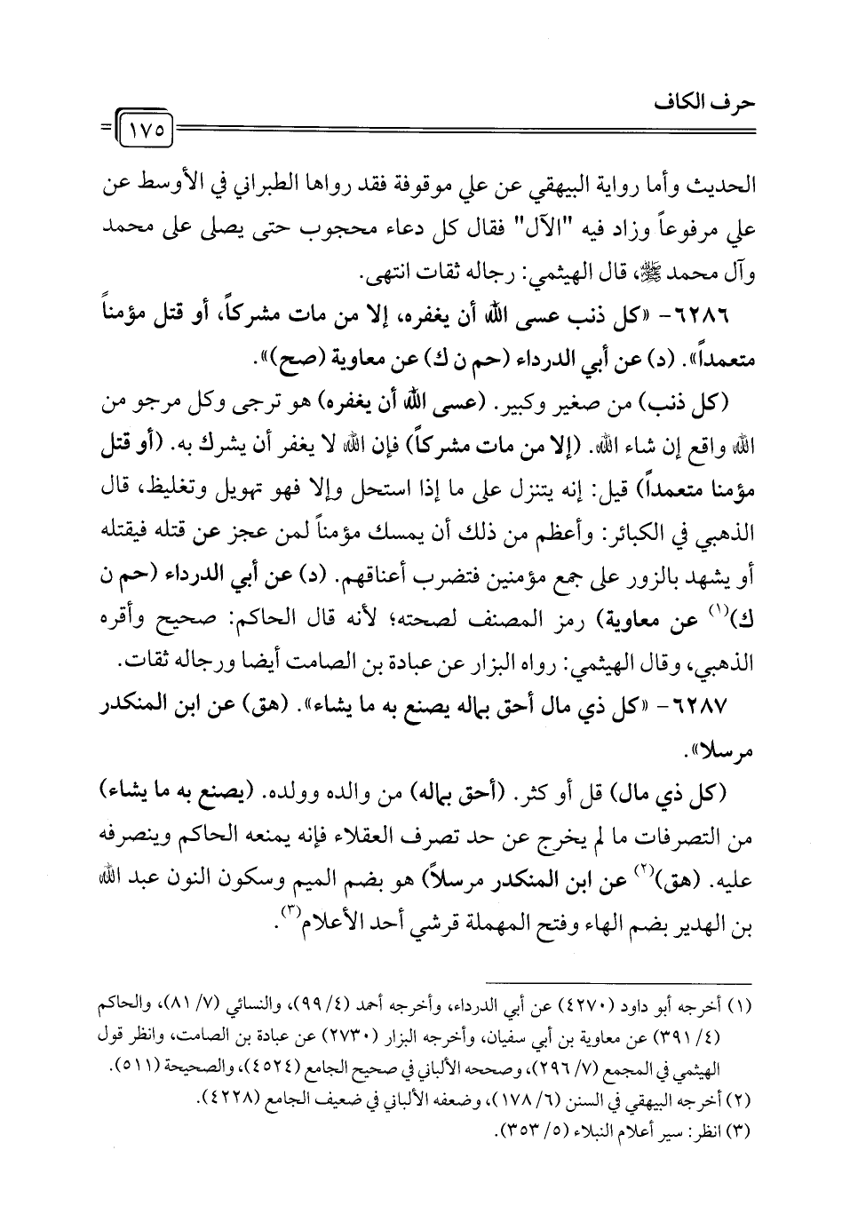 6286 - "كل ذنب عسى الله أن يغفره، إلا من مات مشركاً، أو قتل مؤمناً متعمداً". (د) عن أبي الدرداء (حم ن ك) عن معاوية (صح) ".