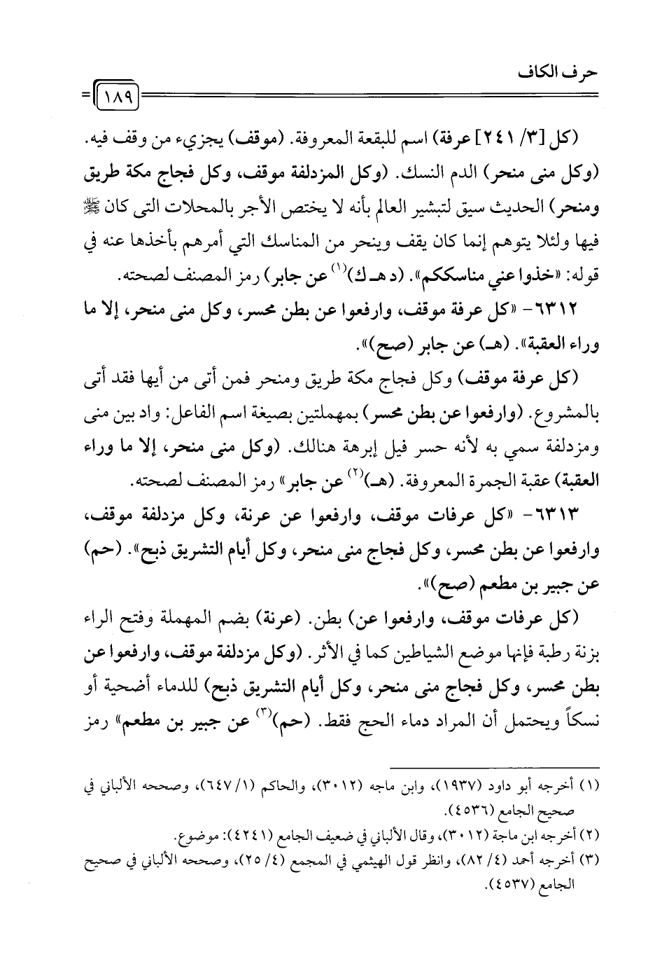 6312 - "كل عرفة موقف، وارفعوا عن بطن محسر، وكل منى منحر، إلا ما وراء العقبة". (هـ) عن جابر (صح) ".