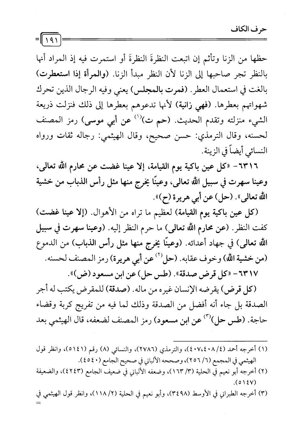 (كل عين باكية يوم القيامة) لعظيم ما تراه من الأهوال. (إلا عيناً غضت) كفت النظر. (عن محارم الله تعالى) ما حرم النظر إليه. (وعيناً سهرت في سبيل الله تعالى) في جهاد أعدائه. (وعيناً يخرج منها مثل رأس الذباب) من الدموع (من خشية الله) وخوف عقابه. (حل (¬2) عن أبي هريرة) رمز المصنف لحسنه.
