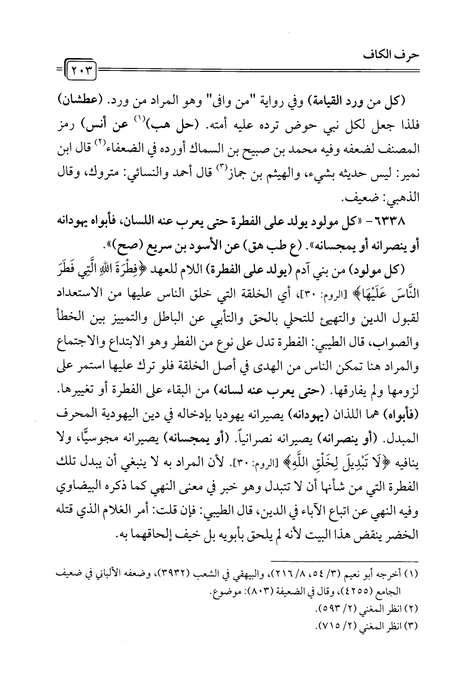 6338 - "كل مولود يولد على الفطرة حتى يعرب عنه اللسان، فأبواه يهودانه أو ينصرانه أو يمجسانه". (ع طب هق) عن الأسود بن سريع (صح) ".