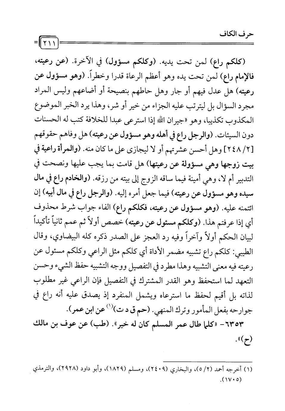 (كلكم راع) لمن تحت يديه. (وكلكم مسؤول) في الآخرة. (عن رعيته، فالإمام راع) لمن تحت يده وهو أعظم الرعاة قدرا وخطراً. (وهو مسؤول عن رعيته) هل عدل فيهم أو جار وهل حاطهم بنصيحة أو أضاعهم وليس المراد مجرد السؤال بل ليترتب عليه الجزاء من خير أو شر، وهذا يرد الخبر الموضوع المكذوب تكذيباً، وهو "جيران الله إذا استرعى عبداً للخلافة كتب له الحسنات دون السيئات. (والرجل راع في أهله وهو مسؤول عن رعيته) هل وفاهم حقوقهم [2/ 248] وهل أحسن عشرتهم أو لا ليجازى على ما كان منه. (والمرأة راعية في بيت زوجها وهي مسؤولة عن رعيتها) هل قامت بما يجب عليها ونصحت في التدبير أم لا، وهي أمينة فيما ساقه الزوج إلى بيته من رزقه. (والخادم راع في مال سيده وهو مسؤول عن رعيته) فيما جعل أمره إليه. (والرجل راع في مال أبيه) إن ائتمنه عليه. (وهو مسؤول عن رعيته، فكلكم راع) الفاء جواب شرط محذوف أي إذا عرفتم هذا. (وكلكم مسئول عن رعيته) خصص أولاً ثم عمم ثانياً تأكيداً لبيان الحكم أولاً وآخراً وفيه رد العجز على الصدر ذكره كله البيضاوي، وقال الطيبي: كلكم راع تشبيه مضمر الأداة أي كلكم مثل الراعي وكلكم مسئول عن رعيته فيه معنى التشبيه وهذا مطرد في التفصيل ووجه التشبيه حفظ الشيء وحسن التعهد لما استحفظ وهو القدر المشترك في التفصيل فإن الراعي غير مطلوب لذاته بل أقيم لحفظ ما استرعاه ويشمل المنفرد إذ يصدق عليه أنه راع في جوارحه بفعل المأمور وترك المنهي. (حم ق د ت) (¬1) عن ابن عمر).