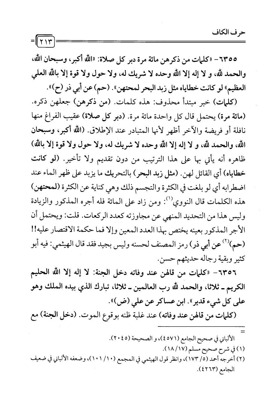 (كلمات) خبر مبتدأ محذوف: هذه كلمات. (من ذكرهن) جعلهن ذكره. (مائة مرة) يحتمل قال كل واحدة مائة مرة. (دبر كل صلاة) عقيب الفراغ منها نافلة أو فريضة والآخر أظهر لأنها المتبادر عند الإطلاق. (الله أكبر، وسبحان الله، والحمد لله، ولا إله إلا الله وحده لا شريك له، ولا حول ولا قوة إلا بالله) ظاهره أنه يأتي بها على هذا الترتيب من دون تقديم ولا تأخير. (لو كانت خطاياه) أي القائل لهن. (مثل زبد البحر) بالتحريك ما يزبد على ظهر الماء عند اضطرابه أي لو بلغت في الكثرة والتجسم ذلك وهي كناية عن الكثرة (لمحتهن) هذه الكلمات قال النووي (¬1): ومن زاد على المائة فله أجره المذكور والزيادة وليس هذا من التحديد المنهي عن مجاوزته كعدد الركعات. قلت: ويحتمل أن الأجر المذكور بعينه يختص بهذا العدد المعين وإلا فما حكمة الاقتصار عليه!! (حم) (¬2) عن أبي ذر) رمز المصنف لحسنه وليس بجيد فقد قال الهيثمي: فيه أبو كثير وبقية رجاله حديثهم حسن.