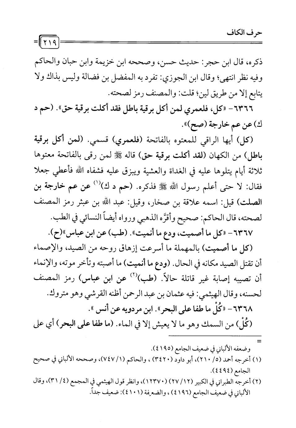 6366 - "كل، فلعمري لمن أكل برقية باطل فقد أكلت برقية حق". (حم د ك) عن عم خارجة (صح) ".