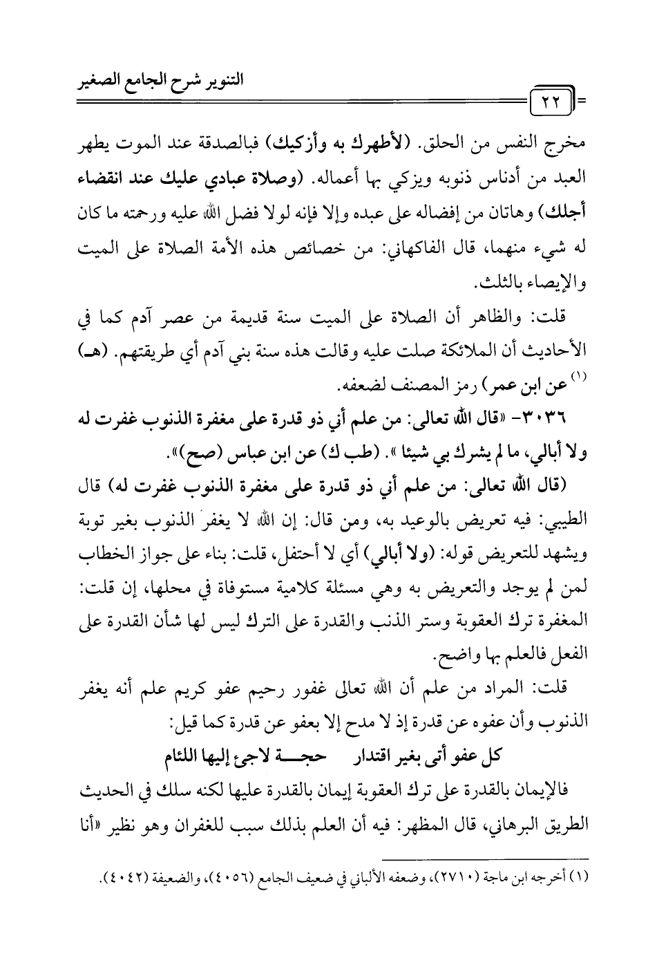 3036 - "قال الله تعالى: من علم أني ذو قدرة على مغفرة الذنوب غفرت له ولا أبالي، ما لم يشرك بي شيئاً". (طب ك) عن ابن عباس (صح) ".