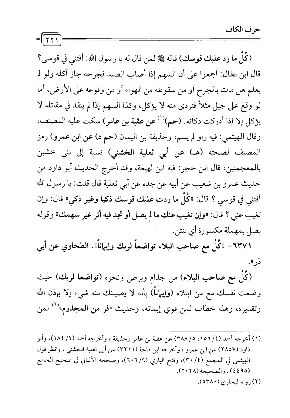 (¬1) أخرجه أحمد (4/ 156، 5/ 388) عن عقبة بن عامر وحذيفة، وأخرجه أحمد (2/ 184)، وأبو داود (2857) عن ابن عمرو، وأخرجه ابن ماجة (3211) عن أبي ثعلبة الخشني، وانظر قول الهيثمي في المجمع (4/ 30)، وفتح الباري (9/ 606)، وصححه الألباني في صحيح الجامع (4495)، والصحيحة (2028).
