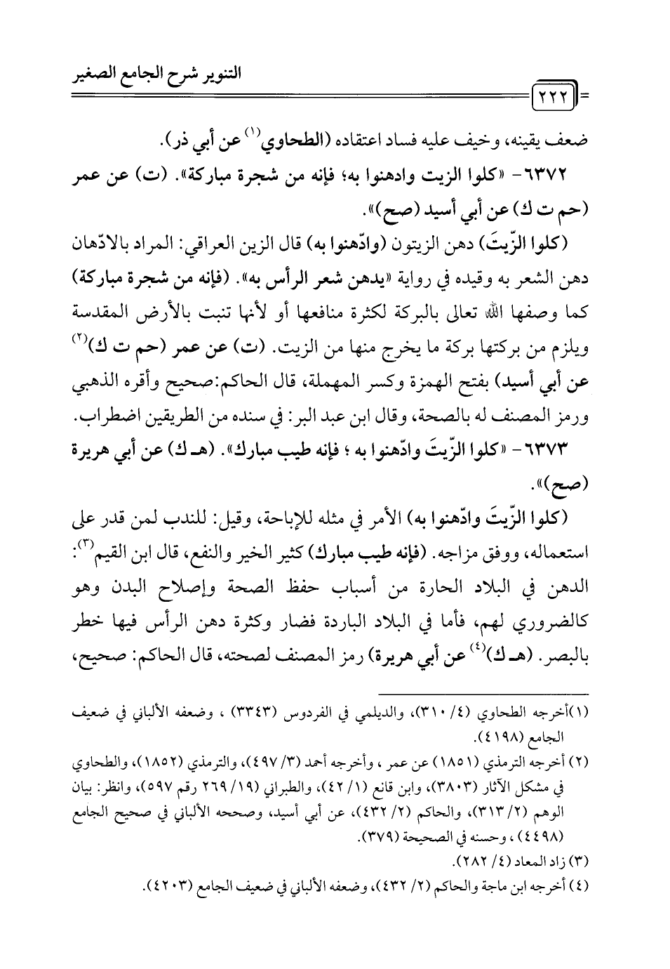 6372 - "كلوا الزيت وادهنوا به؛ فإنه من شجرة مباركة". (ت) عن عمر (حم ت ك) عن أبي أسيد (صح) ".
