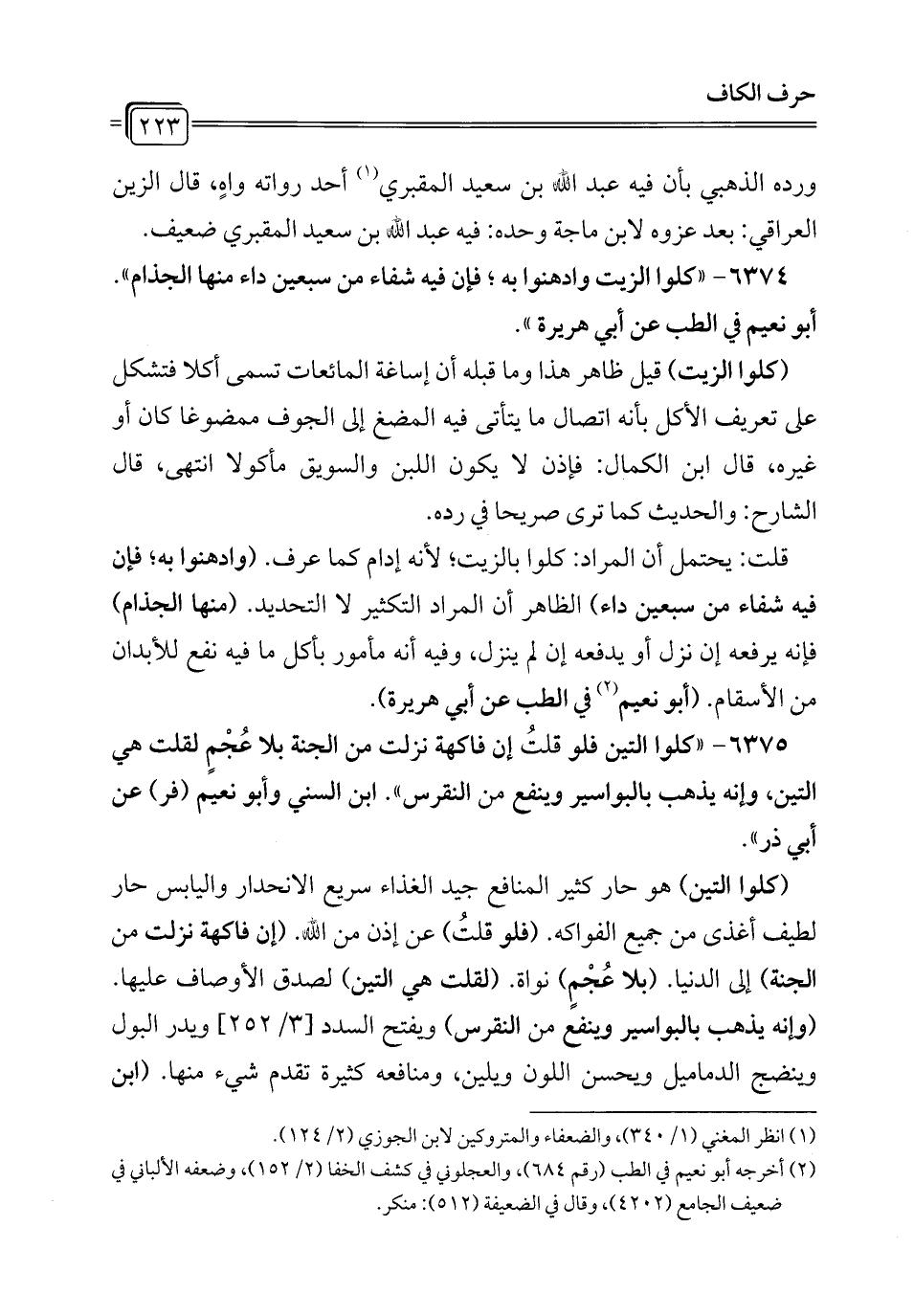 6374 - "كلوا الزيت وادهنوا به؛ فإن فيه شفاء من سبعين داء منها الجذام". أبو نعيم في الطب عن أبي هريرة".