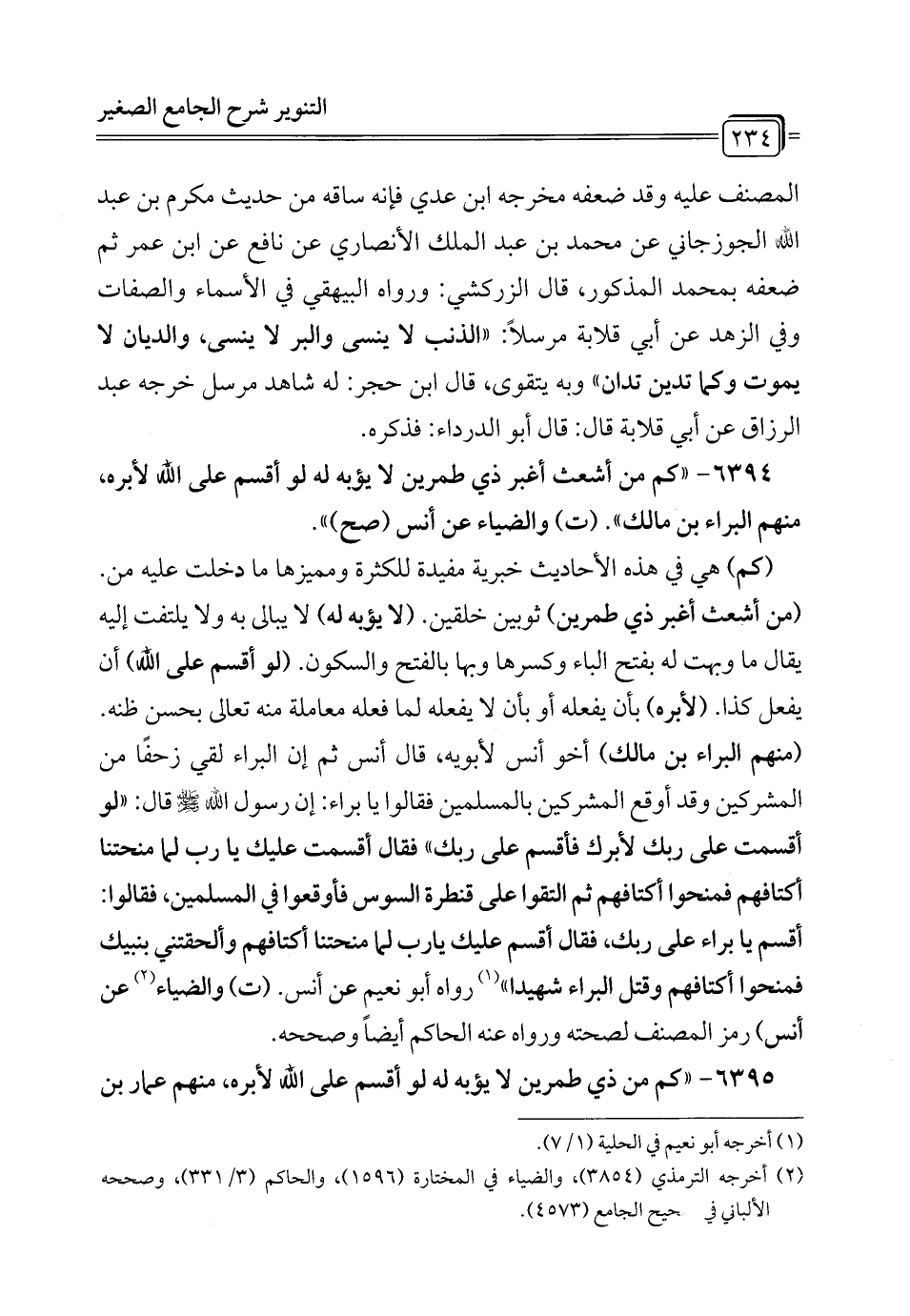 (كم) هي في هذه الأحاديث خبرية مفيدة للكثرة ومميزها ما دخلت عليه من. (من أشعث أكبر ذي طمرين) ثوبين خلقين. (لا يؤبه له) لا يبالى به ولا يلتفت إليه يقال ما وبهت له بفتح الباء وكسرها وبها بالفتح والسكون. (لو أقسم على الله) أن يفعل كذا. (لأبره) بأن يفعله أو بأن لا يفعله لما فعله معاملة منه تعالى بحسن ظنه. (منهم البراء بن مالك) أخو أنس لأبويه، قال أنس ثم إن البراء لقي زحفاً من المشركين وقد أوقع المشركين بالمسلمين فقالوا يا براء: إن رسول الله - صلى الله عليه وسلم - قال: "لو أقسمت على ربك لأبرك فأقسم على ربك" فقال أقسمت عليك يا رب لما منحتنا أكتافهم فمنحوا أكتافهم ثم التقوا على قنطرة السوس فأوقعوا في المسلمين، فقالوا: أقسم يا براء على ربك، فقال أقسم عليك يا رب لما منحتنا أكتافهم وألحقتني بنبيك فمنحوا أكتافهم وقتل البراء شهيدا" (¬1) رواه أبو نعيم عن أنس. (ت) والضياء (¬2) عن أنس) رمز المصنف لصحته ورواه عنه الحاكم أيضاً وصححه.