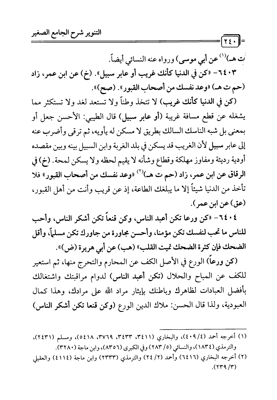 6403 - "كن في الدنيا كأنك غريب أو عابر سبيل". (خ) عن ابن عمر، زاد (حم ت هـ) "وعد نفسك من أصحاب القبور". (صح) ".