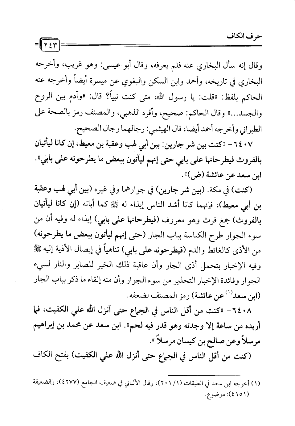 6407 - "كنت بين شر جارين: بين أبي لهب وعقبة بن معيط، إن كانا ليأتيان بالفروث فيطرحانها على بابي حتى إنهم ليأتون ببعض ما يطرحونه على بابي". ابن سعد عن عائشة (ض) ".
