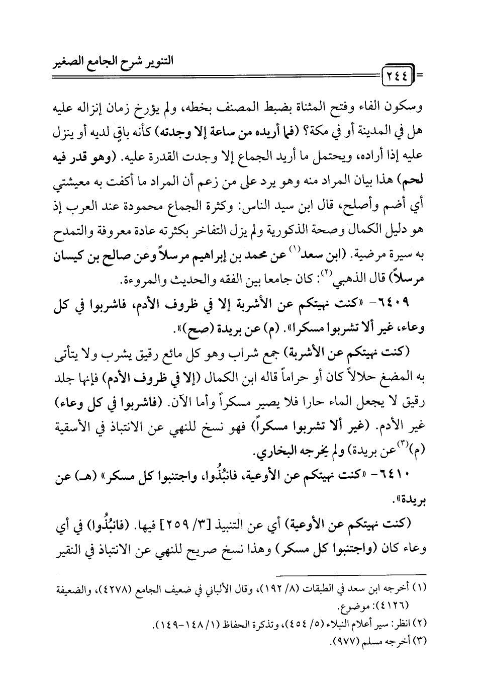6409 - "كنت نهيتكم عن الأشربة إلا في ظروف الأدم، فاشربوا في كل وعاء، غير ألا تشربوا مسكرا". (م) عن بريدة (صح) ".
