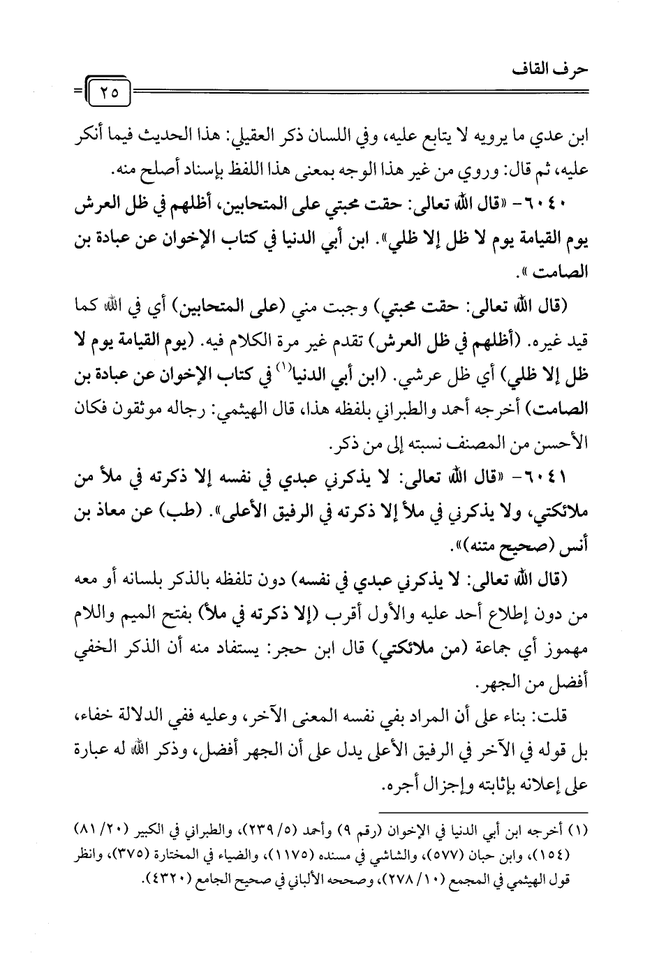 6040 - "قال الله تعالى: حقت محبتي على المتحابين، أظلهم في ظل العرش يوم القيامة يوم لا ظل إلا ظلي". ابن أبي الدنيا في كتاب الإخوان عن عبادة بن الصامت".
