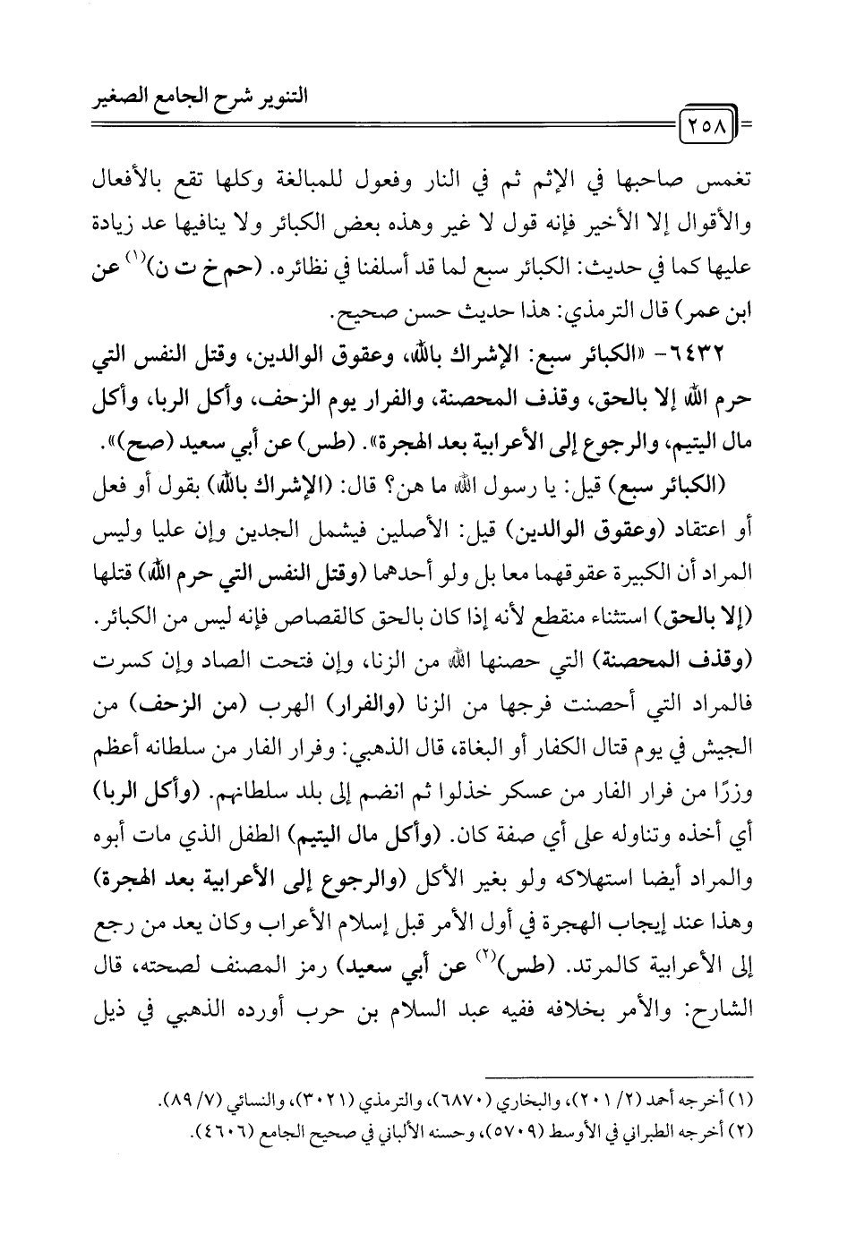 6432 - "الكبائر سبع: الإشراك بالله، وعقوق الوالدين، وقتل النفس التي حرم الله إلا بالحق، وقذف المحصنة، والفرار يوم الزحف وأكل الربا، وأكل مال اليتيم، والرجوع إلى الأعرابية بعد الهجرة". (طس) عن أبي سعيد (صح) ".