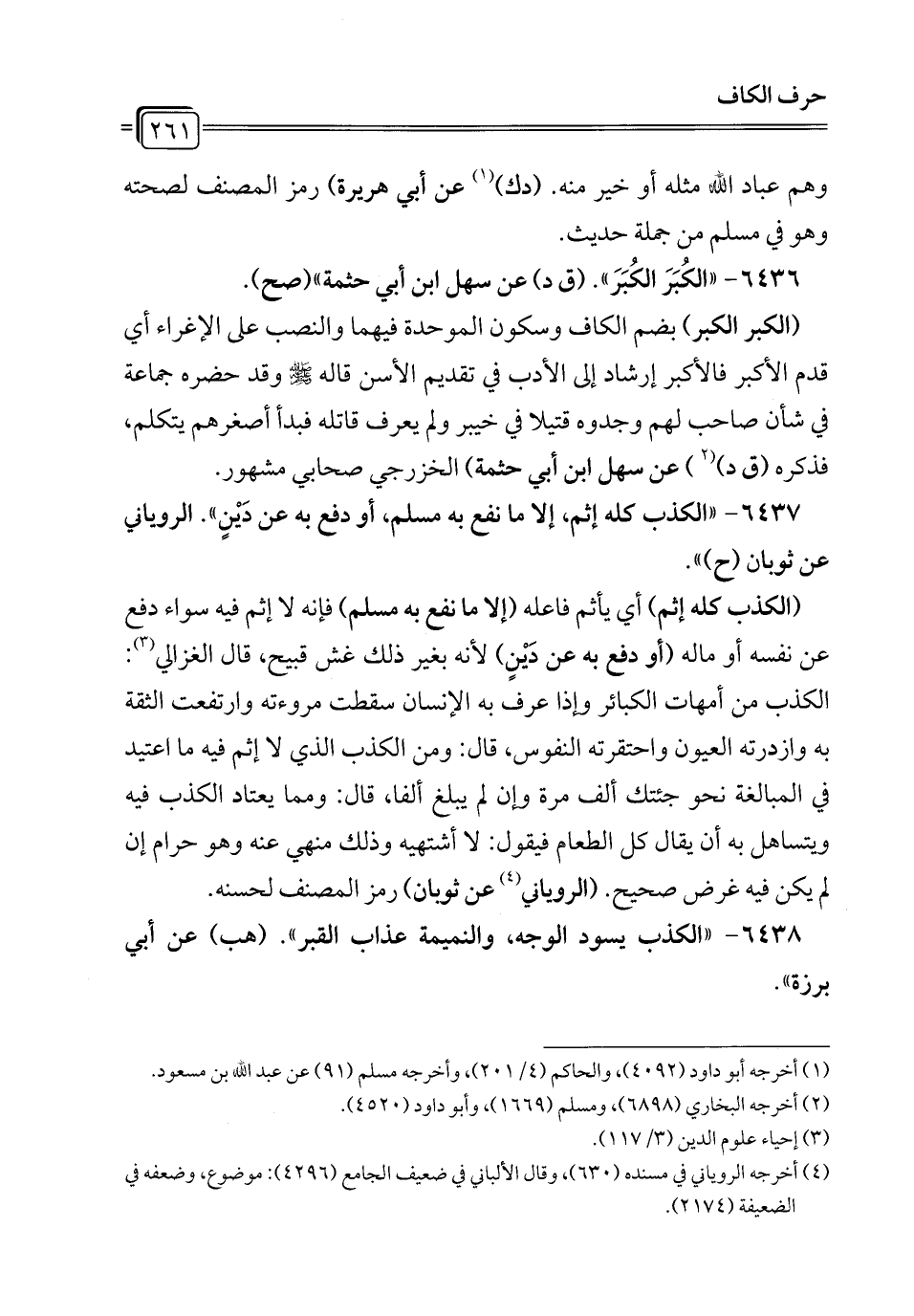 6437 - "الكذب كله إثم، إلا ما نفع به مسلم، أو دفع به عن دَيْنٍ". الروياني عن ثوبان (ح) ".