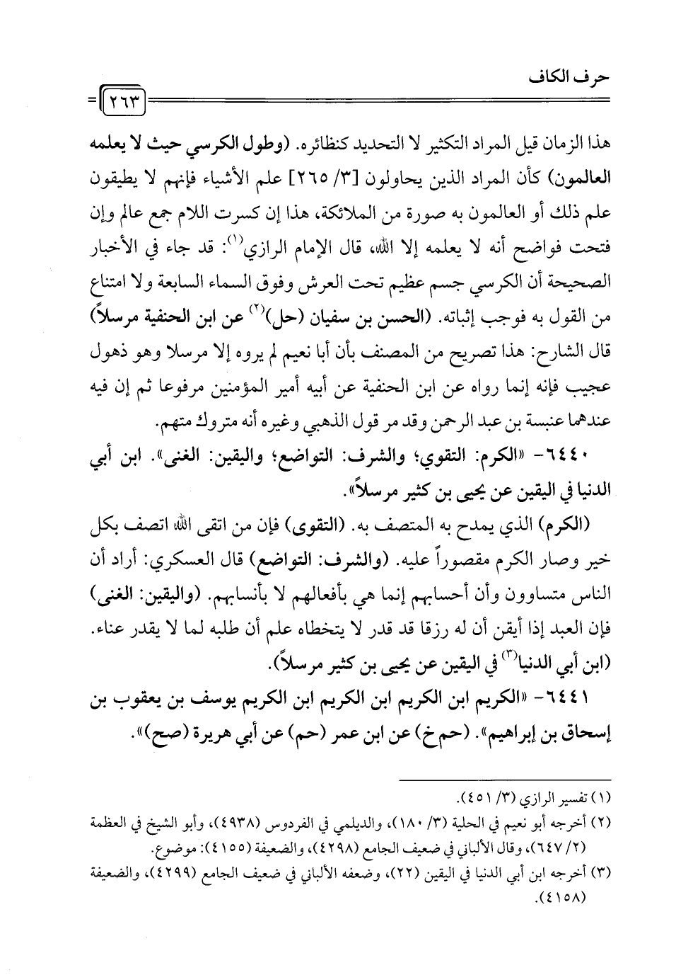 6440 - "الكرم: التقوي؛ والشرف: التواضع؛ واليقين: الغنى". ابن أبي الدنيا في اليقين عن يحيى بن كثير مرسلاً".