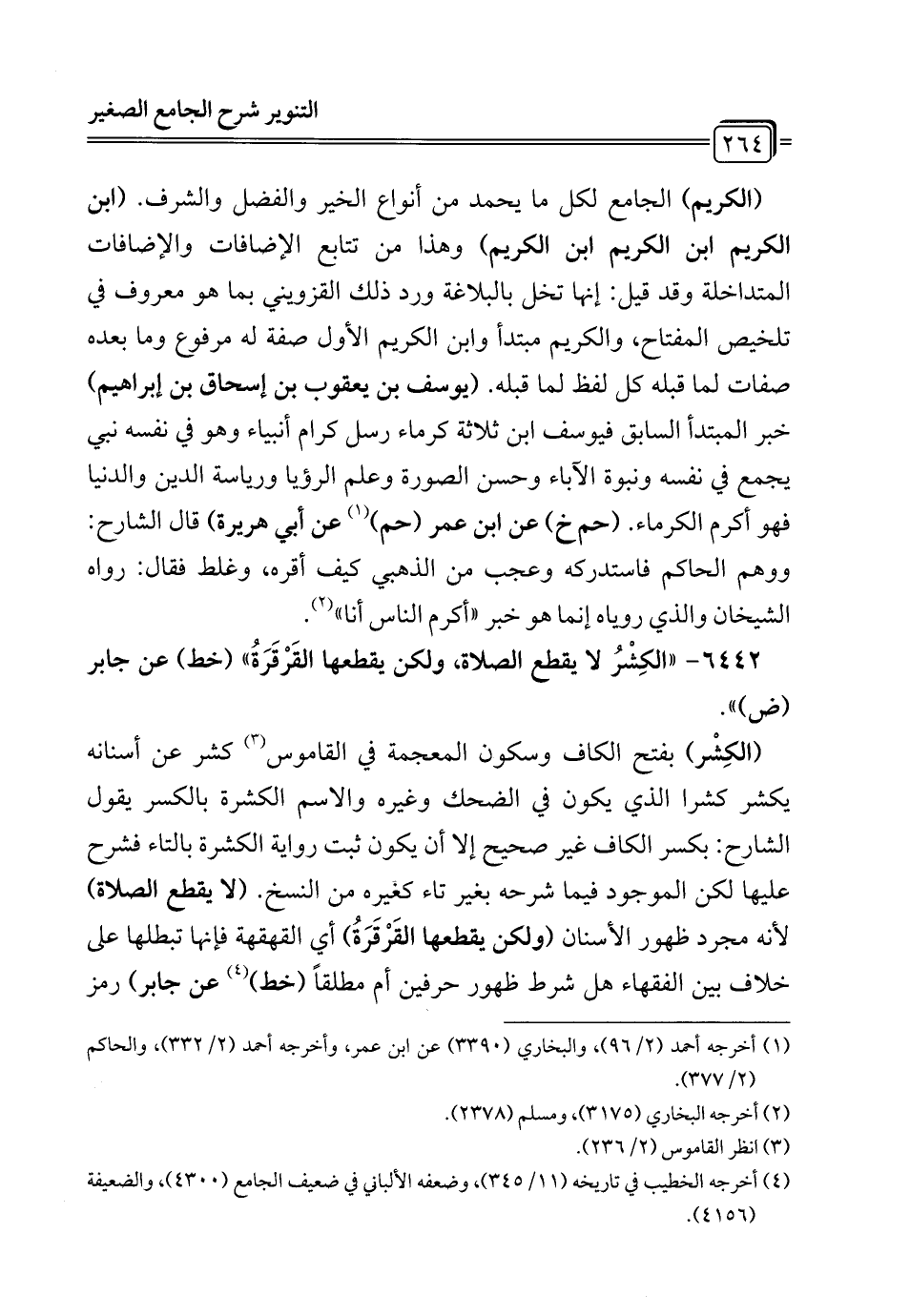 6442 - "الكِشْرُ لا يقطع الصلاة، ولكن يقطعها القَرْقَرَةُ" (خط) عن جابر (ض) ".