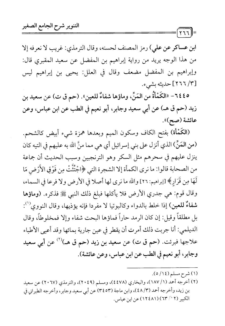 6445 - "الكَمْأةُ من المَنِّ، وماؤها شفاءٌ للعين". (حم ق ت) عن سعيد بن زيد (حم ق هـ) عن أبي سعيد وجابر، أبو نعيم في الطب عن ابن عباس، وعن عائشة (صح) ".