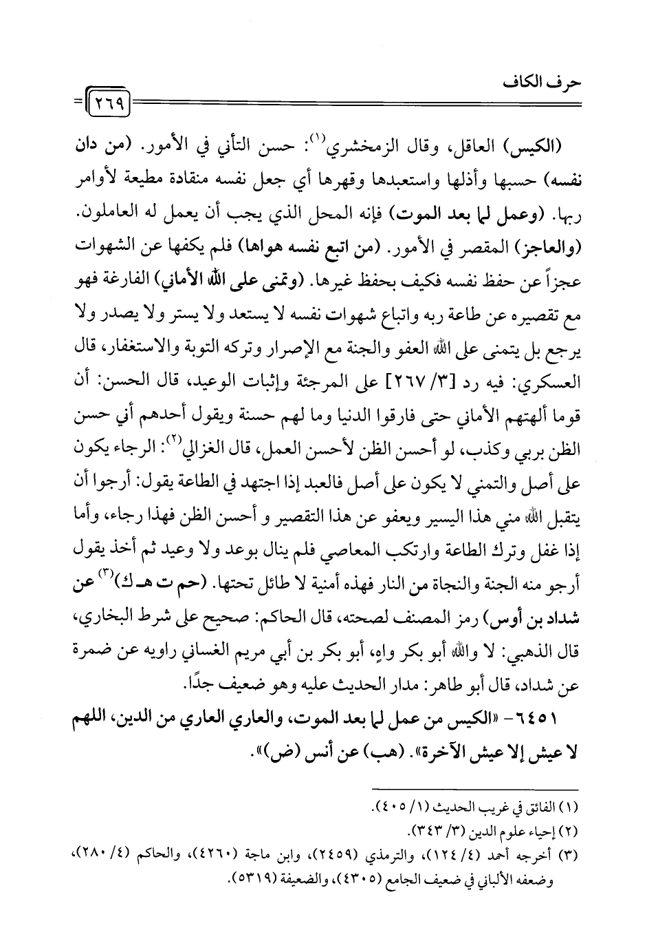 (الكيس) العاقل، وقال الزمخشري (¬1): حسن التأني في الأمور. (من دان نفسه) حسبها وأذلها واستعبدها وقهرها أي جعل نفسه منقادة مطيعة لأوامر ربها. (وعمل لما بعد الموت) فإنه المحل الذي يجب أن يعمل له العاملون. (والعاجز) المقصر في الأمور. (من اتبع نفسه هواها) فلم يكفها عن الشهوات عجزاً عن حفظ نفسه فكيف بحفظ غيرها. (وتمنى على الله الأماني) الفارغة فهو مع تقصيره عن طاعة ربه واتباع شهوات نفسه لا يستعد ولا يستر ولا يصدر ولا يرجع بل يتمنى على الله العفو والجنة مع الإصرار وتركه التوبة والاستغفار، قال العسكري: فيه رد [3/ 267] على المرجئة وإثبات الوعيد، قال الحسن: أن قوماً ألهتهم الأماني حتى فارقوا الدنيا وما لهم حسنة ويقول أحدهم أني حسن الظن بربي وكذب، لو أحسن الظن لأحسن العمل، قال الغزالي (¬2): الرَّجاء يكون على أصل والتمني لا يكون على أصل فالعبد إذا اجتهد في الطاعة يقول: أرجوا أن يتقبل الله مني هذا اليسير ويعفو عن هذا التقصير وأحسن الظن فهذا رجاء، وأما إذا غفل وترك الطاعة وارتكب المعاصي فلم ينال بوعد ولا وعيد ثم أخذ يقول أرجو منه الجنة والنجاة من النار فهذه أمنية لا طائل تحتها. (حم ت هـ ك) (¬3) عن شداد بن أوس) رمز المصنف لصحته، قال الحاكم: صحيح على شرط البخاري، قال الذهبي: لا والله أبو بكر واهٍ، أبو بكر بن أبي مريم الغساني راويه عن ضمرة عن شداد، قال أبو طاهر: مدار الحديث عليه وهو ضعيف جدًا.