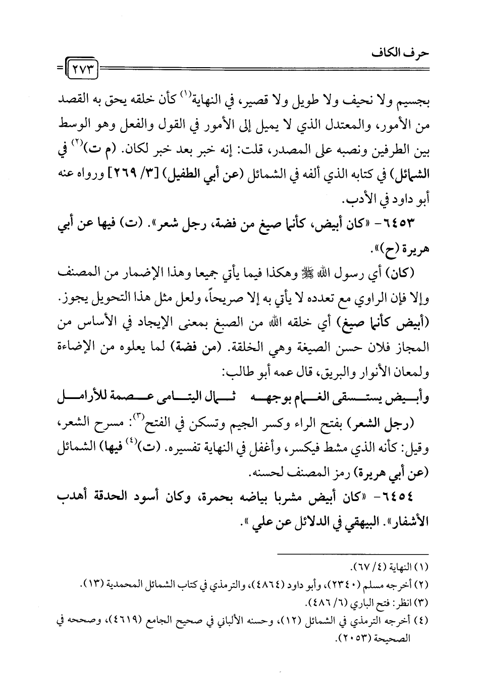 6453 - "كان أبيض، كأنما صيغ من فضة، رجل شعر". (ت) فيها عن أبي هريرة (ح) ".