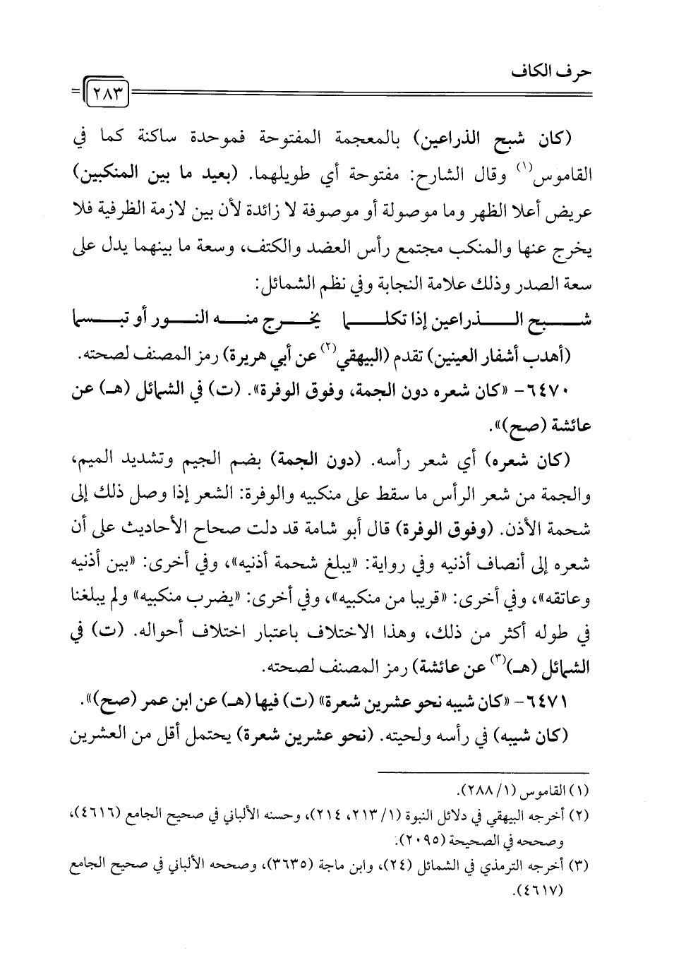 6470 - "كان شعره دون الجمة، وفوق الوفرة". (ت) في الشمائل (هـ) عن عائشة (صح) ".
