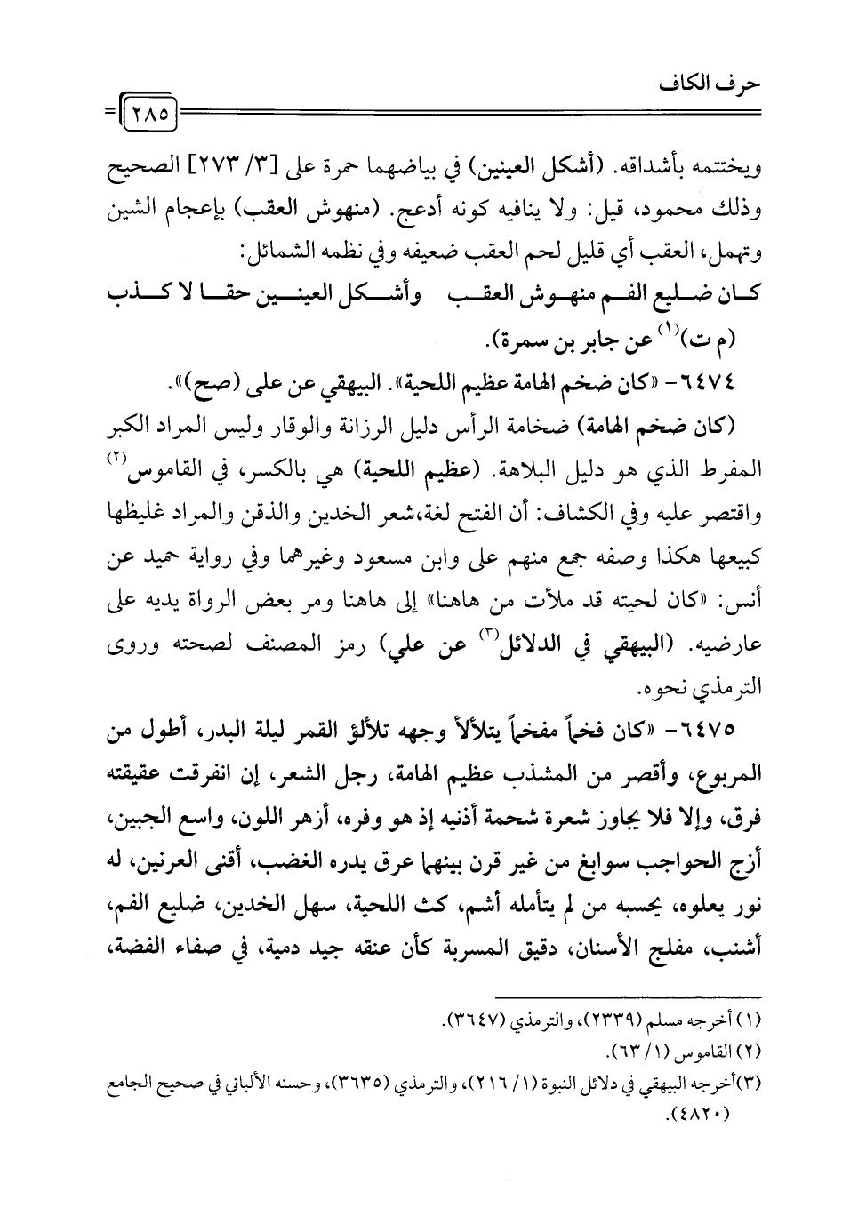 6474 - "كان ضخم الهامة عظيم اللحية". البيهقي عن علي (صح) ".