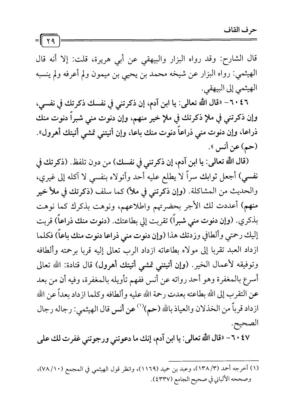 (قال الله تعالى: يا ابن آدم، إن ذكرتني في نفسك) من دون تلفظ. (ذكرتك في نفسي) أجعل ثوابك سراً لا يطلع عليه أحد وأتولاه بنفسي لا آكله إلى غيري، والحديث من المشاكلة. (وإن ذكرتني في ملأ) كما سلف (ذكرتك في ملأ خير منهم) أعددت لك الأجر بحضرتهم واطلاعهم، ونوهت بذكرك كما نوهت بذكري. (وإن دنوت مني شبراً) تقربت إلى بطاعتك. (دنوت منك ذراعاً) قربت إليك رحمتي وألطافي وزدتك هذا (وإن دنوت مني ذراعا دنوت منك باعاً) فكلما ازداد العبد تقربا إلى مولاه بطاعاته ازداد الرب تعالى إليه قربا برحمته وألطافه وتوفيقه لأعمال الخير. (وإن أتيتني تمشي أتيتك أهرول) قال قتادة: الله تعالى أسرع بالمغفرة وهو أحد رواته عن أنس ففهم تأويله بالمغفرة، وفيه أن من بعد عن التقرب إلى الله بطاعته بعدت رحمة الله عليه وألطافه وكلما ازداد بعداً عن الله ازداد قرباً من الخذلان والعياذ الله (حم) (¬1) عن أنس قال الهيثمي: رجاله رجال الصحيح.