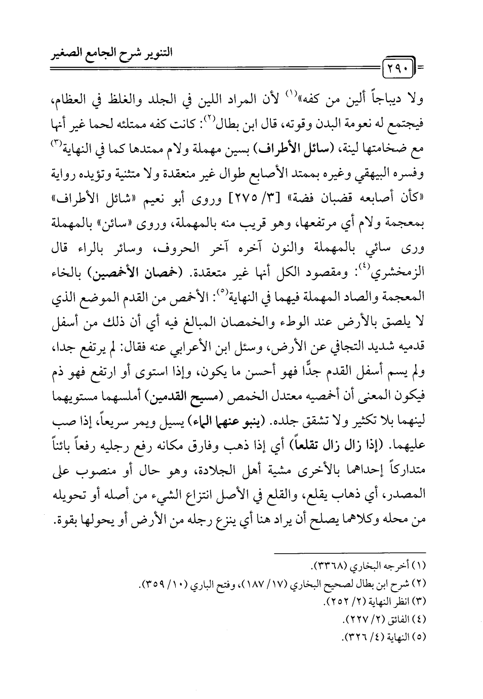 ولا ديباجاً ألين من كفه" (¬1) لأن المراد اللين في الجلد والغلظ في العظام، فيجتمع له نعومة البدن وقوته، قال ابن بطال (¬2): كانت كفه ممتلئه لحماً غير أنها مع ضخامتها لينة، (سائل الأطراف) بسين مهملة ولام ممتدها كما في النهاية (¬3) وفسره البيهقي وغيره بممتد الأصابع طوال غير منعقدة ولا متثنية وتؤيده رواية "كأن أصابعه قضبان فضة" [3/ 275] وروى أبو نعيم "شائل الأطراف" بمعجمة ولام أي مرتفعها، وهو قريب منه بالمهملة، وروى "سائن" بالمهملة ورى سائي بالمهملة والنون آخره آخر الحروف، وسائر بالراء قال الزمخشري (¬4): ومقصود الكل أنها غير متعقدة. (خمصان الأخمصين) بالخاء المعجمة والصاد المهملة فيهما في النهاية (¬5): الأخمص من القدم الموضع الذي لا يلصق بالأرض عند الوطء والخمصان المبالغ فيه أي أن ذلك من أسفل قدميه شديد التجافي عن الأرض، وسئل ابن الأعرابي عنه فقال: لم يرتفع جداً، ولم يسم أسفل القدم جدًّا فهو أحسن ما يكون، وإذا استوى أو ارتفع فهو ذم فيكون المعنى أن أخمصيه معتدل الخمص (مسيح القدمين) أملسهما مستويهما لينهما بلا تكثير ولا تشقق جلده. (ينبو عنهما الماء) يسيل ويمر سريعاً، إذا صب عليهما. (إذا زال زال تقلعاً) أي إذا ذهب وفارق مكانه رفع رجليه رفعاً بائناً متداركاً إحداهما بالأخرى مشية أهل الجلادة، وهو حال أو منصوب على المصدر، أي ذهاب يقلع، والقلع في الأصل انتزاع الشيء من أصله أو تحويله من محله وكلاهما يصلح أن يراد هنا أي ينزع رجله من الأرض أو يحولها بقوة.