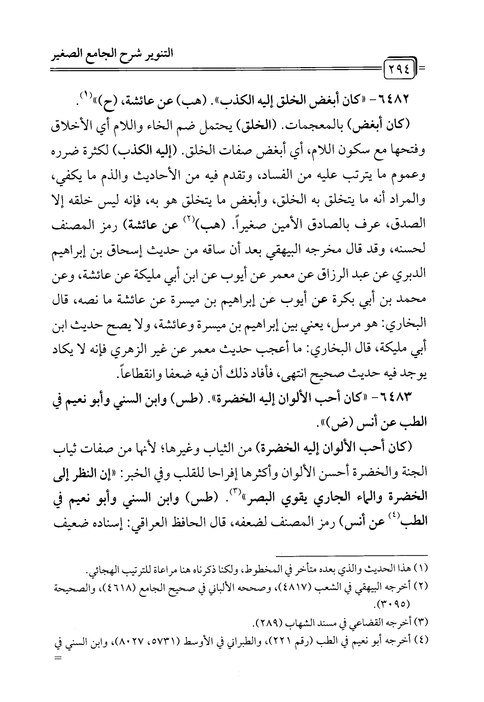 6483 - "كان أحب الألوان إليه الخضرة". (طس) وابن السني وأبو نعيم في الطب عن أنس (ض) ".