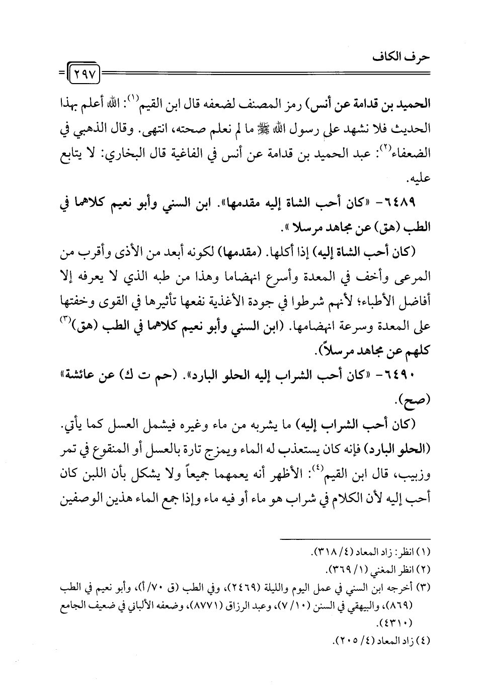 6489 - "كان أحب الشاة إليه مقدمها". ابن السني وأبو نعيم كلاهما في الطب (هق) عن مجاهد مرسلاً".
