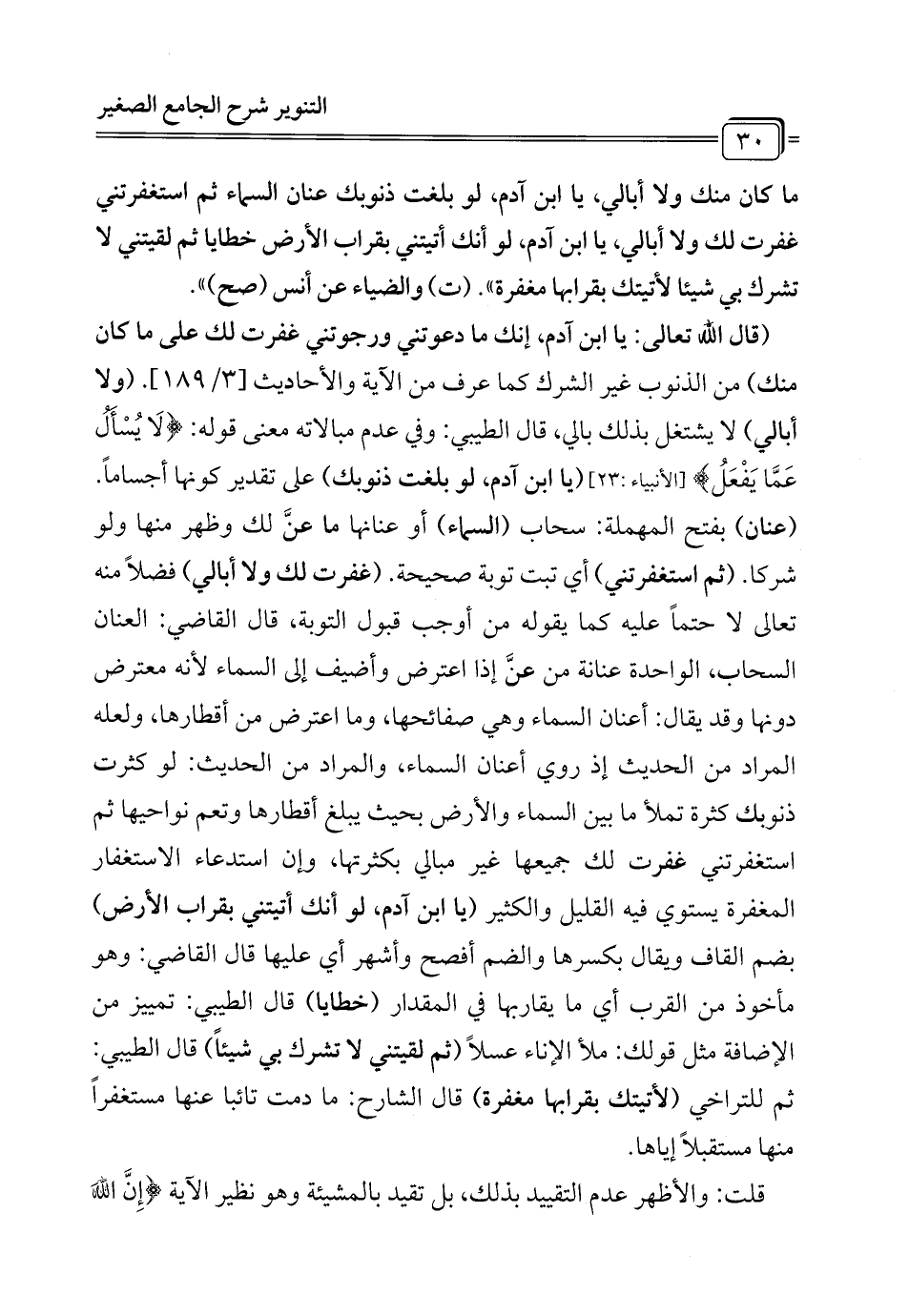 (قال الله تعالى: يا ابن آدم، إنك ما دعوتني ورجوتني غفرت لك على ما كان منك) من الذنوب غير الشرك كما عرف من الآية والأحاديث [3/ 189]. (ولا أبالي) لا يشتغل بذلك بالي، قال الطيبي: وفي عدم مبالاته معنى قوله: {لَا يُسْأَلُ عَمَّا يَفْعَلُ} [الأنبياء: 23] (يا ابن آدم، لو بلغت ذنوبك) على تقدير كونها أجساماً. (عنان) بفتح المهملة: سحاب (السماء) أو عنانها ما عنَّ لك وظهر منها ولو شركا. (ثم استغفرتني) أي تبت توبة صحيحة. (غفرت لك ولا أبالي) فضلاً منه تعالى لا حتماً عليه كما يقوله من أوجب قبول التوبة، قال القاضي: العنان السحاب، الواحدة عنانة من عنَّ إذا اعترض وأضيف إلى السماء لأنه معترض دونها وقد يقال: أعنان السماء وهي صفائحها، وما اعترض من أقطارها, ولعله المراد من الحديث إذ روي أعنان السماء، والمراد من الحديث: لو كثرت ذنوبك كثرة تملأ ما بين السماء والأرض بحيث يبلغ أقطارها وتعم نواحيها ثم استغفرتني غفرت لك جميعها غير مبالي بكثرتها، وان استدعاء الاستغفار المغفرة يستوي فيه القليل والكثير (يا ابن آدم، لو أنك أتيتني بقراب الأرض) بضم القاف ويقال بكسرها والضم أفصح وأشهر أي عليها قال القاضي: وهو مأخوذ من القرب أي ما يقاربها في المقدار (خطايا) قال الطيبي: تمييز من الإضافة مثل قولك: ملأ الإناء عسلاً (ثم لقيتني لا تشرك بي شيئاً) قال الطيبي: ثم للتراخي (لأتيتك بقرابها مغفرة) قال الشارح: ما دمت تائبا عنها مستغفراً منها مستقبلاً إياها.