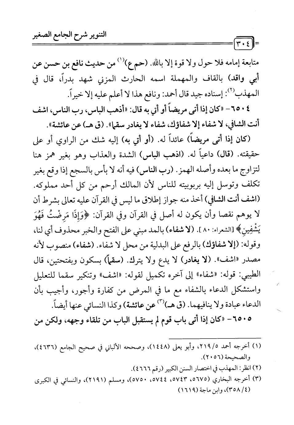 6504 - "كان إذا أتى مريضاً أو أتي به قال: "أذهب الباس، رب الناس، اشف أنت الشافي، لا شفاء إلا شفاؤك، شفاء لا يغادر سقماً". (ق هـ) عن عائشة".