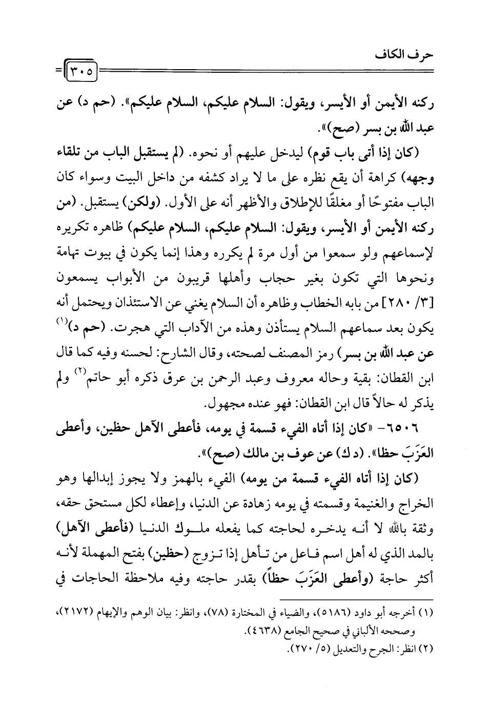 (كان إذا أتى باب قوم) ليدخل عليهم أو نحوه. (لم يستقبل الباب من تلقاء وجهه) كراهة أن يقع نظره على ما لا يراد كشفه من داخل البيت وسواء كان الباب مفتوحاً أو مغلقاً للإطلاق والأظهر أنه على الأول. (ولكن) يستقبل. (من ركنه الأيمن أو الأيسر، ويقول: السلام عليكم، السلام عليكم) ظاهره تكريره لإسماعهم ولو سمعوا من أول مرة لم يكرره وهذا إنما يكون في بيوت تهامة ونحوها التي تكون بغير حجاب وأهلها قريبون من الأبواب يسمعون [3/ 280] من بابه الخطاب وظاهره أن السلام يغني عن الاستئذان ويحتمل أنه يكون بعد سماعهم السلام يستأذن وهذه من الآداب التي هجرت. (حم د) (¬1) عن عبد الله بن بسر) رمز المصنف لصحته، وقال الشارح: لحسنه وفيه كما قال ابن القطان: بقية وحاله معروف وعبد الرحمن بن عرق ذكره أبو حاتم (¬2) ولم يذكر له حالاً قال ابن القطان: فهو عنده مجهول.