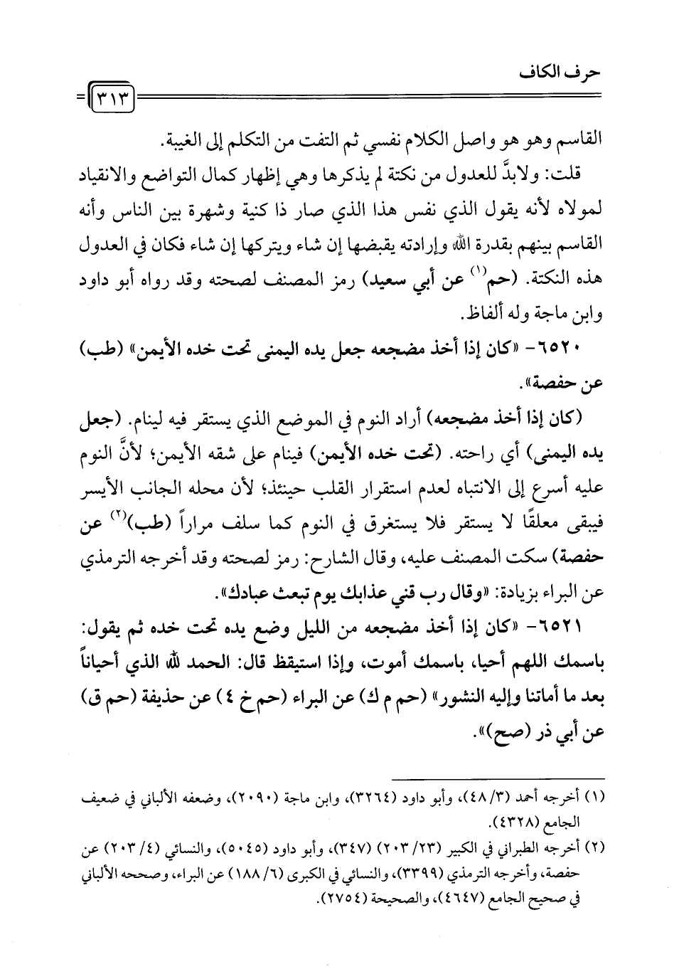 6521 - "كان إذا أخذ مضجعه من الليل وضع يده تحت خده ثم يقول: باسمك اللهم أحيا، باسمك أموت، وإذا استيقظ قال: الحمد لله الذي أحياناً بعد ما أماتنا وإليه النشور" (حم م ك) عن البراء (حم خ 4) عن حذيفة (حم ق) عن أبي ذر (صح) ".