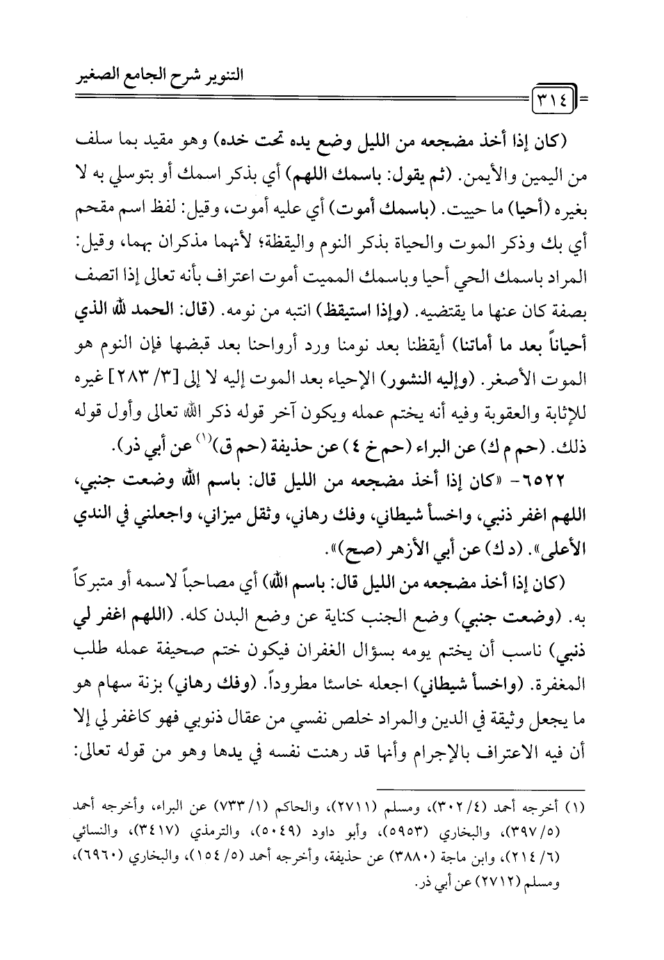 (كان إذا أخذ مضجعه من الليل وضع يده تحت خده) وهو مقيد بما سلف من اليمين والأيمن. (ثم يقول: باسمك اللهم) أي بذكر اسمك أو بتوسلي به لا بغيره (أحيا) ما حييت. (باسمك أموت) أي عليه أموت، وقيل: لفظ اسم مقحم أي بك وذكر الموت والحياة بذكر النوم واليقظة؛ لأنهما مذكران بهما، وقيل: المراد باسمك الحي أحيا وباسمك المميت أموت اعتراف بأنه تعالى إذا اتصف بصفة كان عنها ما يقتضيه. (وإذا استيقظ) انتبه من نومه. (قال: الحمد لله الذي أحياناً بعد ما أماتنا) أيقظنا بعد نومنا ورد أرواحنا بعد قبضها فإن النوم هو الموت الأصغر. (وإليه النشور) الإحياء بعد الموت إليه لا إلى [3/ 283] غيره للإثابة والعقوبة وفيه أنه يختم عمله ويكون آخر قوله ذكر الله تعالى وأول قوله ذلك. (حم م ك) عن البراء (حم خ 4) عن حذيفة (حم ق) (¬1) عن أبي ذر).