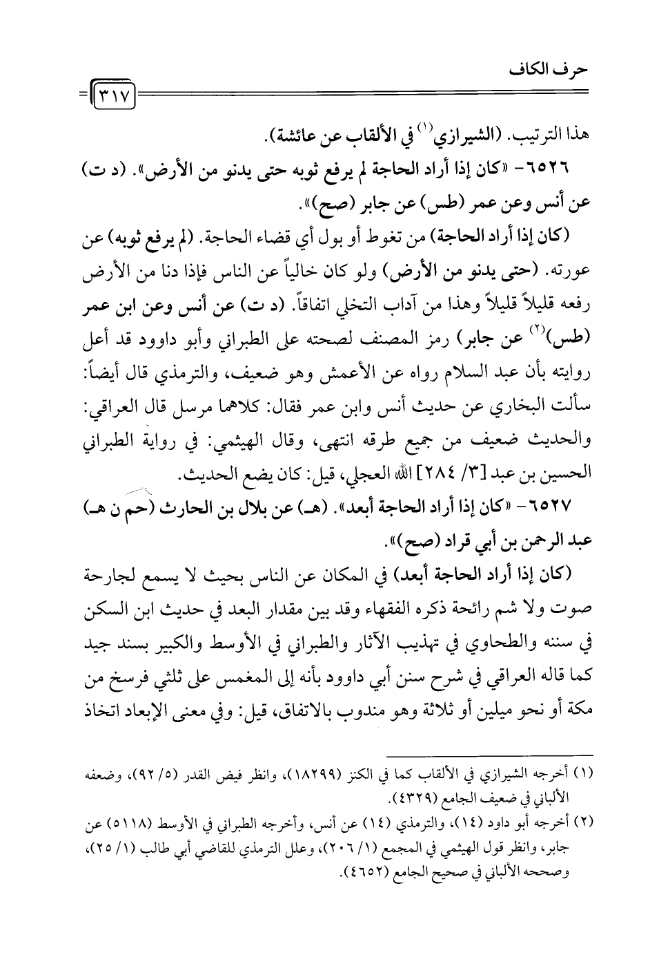 6527 - "كان إذا أراد الحاجة أبعد". (هـ) عن بلال بن الحارث (حم ن هـ) عبد الرحمن بن أبي قراد (صح) ".