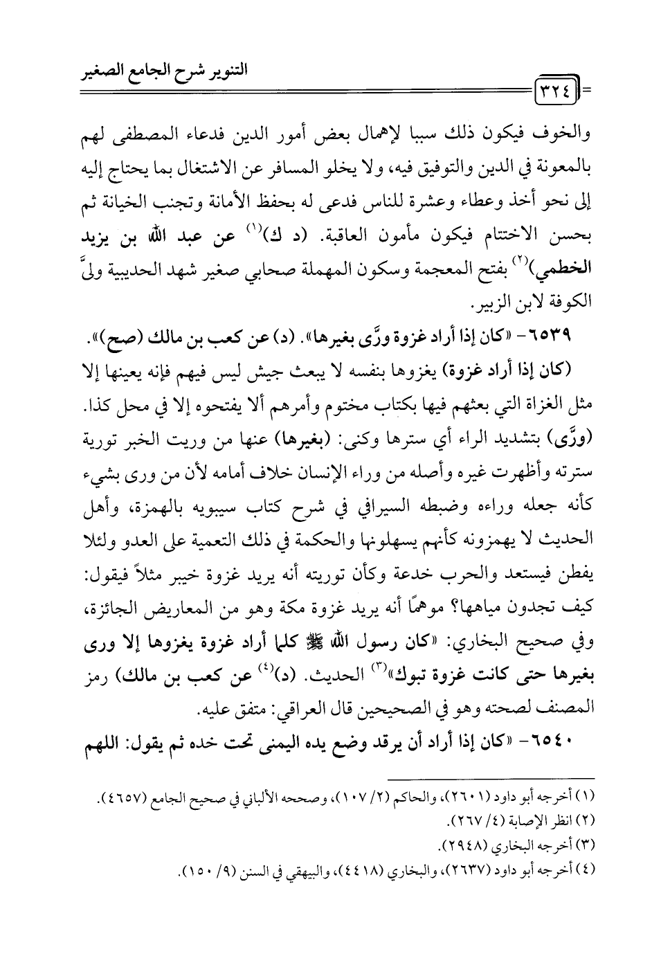 (كان إذا أراد غزوة) يغزوها بنفسه لا يبعث جيش ليس فيهم فإنه يعينها إلا مثل الغزاة التي بعثهم فيها بكتاب مختوم وأمرهم ألا يفتحوه إلا في محل كذا. (ورَّى) بتشديد الراء أي سترها وكنى: (بغيرها) عنها من وريت الخبر تورية سترته وأظهرت غيره وأصله من وراء الإنسان خلاف أمامه لأن من ورى بشيء كأنه جعله وراءه وضبطه السيرافي في شرح كتاب سيبويه بالهمزة، وأهل الحديث لا يهمزونه كأنهم يسهلونها والحكمة في ذلك التعمية على العدو ولئلا يفطن فيستعد والحرب خدعة وكأن توريته أنه يريد غزوة خيبر مثلاً فيقول: كيف تجدون مياهها؟ موهمًا أنه يريد غزوة مكة وهو من المعاريض الجائزة، وفي صحيح البخاري: "كان رسول الله - صلى الله عليه وسلم - كلما أراد غزوة يغزوها إلا ورى بغيرها حتى كانت غزوة تبوك" (¬3) الحديث. (د) (¬4) عن كعب بن مالك) رمز المصنف لصحته وهو في الصحيحين قال العراقي: متفق عليه.