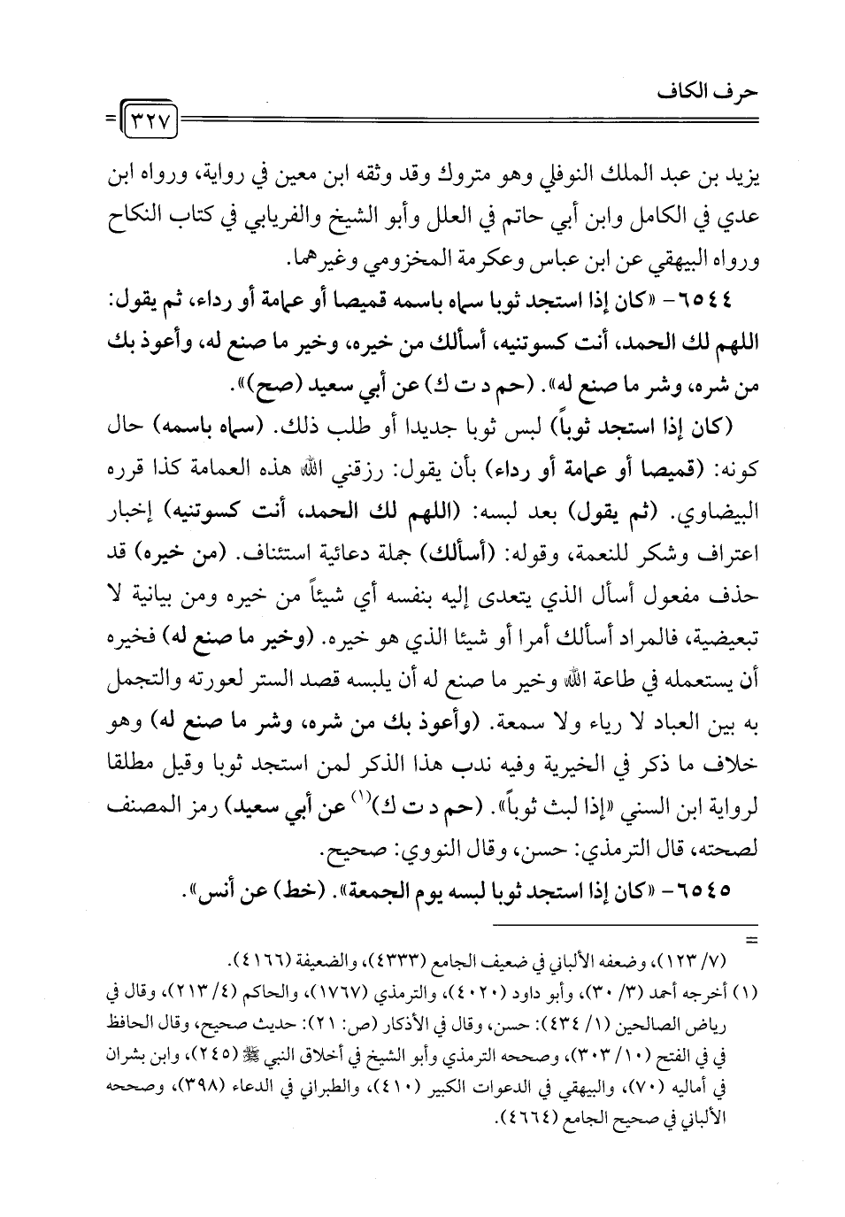 6544 - "كان إذا استجد ثوبا سماه باسمه قميصا أو عمامة أو رداء، ثم يقول: اللهم لك الحمد، أنت كسوتنيه، أسألك من خيره، وخير ما صنع له، وأعوذ بك من شره، وشر ما صنع له". (حم د ت ك) عن أبي سعيد (صح) ".