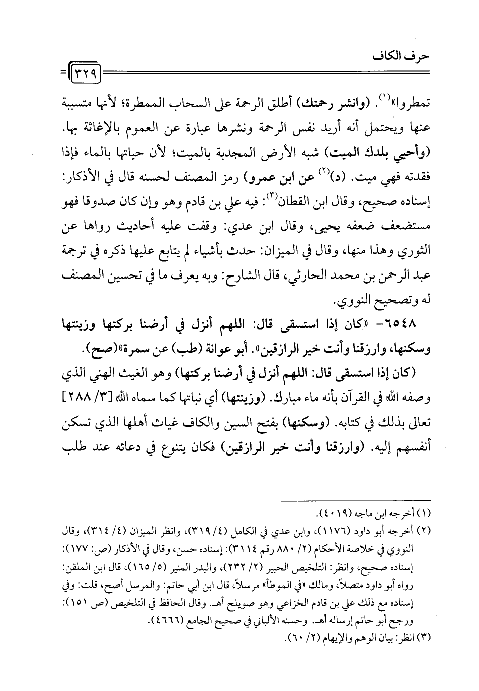 تمطروا" (¬1). (وانشر رحمتك) أطلق الرحمة على السحاب الممطرة؛ لأنها متسببة عنها ويحتمل أنه أريد نفس الرحمة ونشرها عبارة عن العموم بالإغاثة بها. (وأحيي بلدك الميت) شبه الأرض المجدبة بالميت؛ لأن حياتها بالماء فإذا فقدته فهي ميت. (د) (¬2) عن ابن عمرو) رمز المصنف لحسنه قال في الأذكار: إسناده صحيح، وقال ابن القطان (¬3): فيه علي بن قادم وهو وإن كان صدوقا فهو مستضعف ضعفه يحيى، وقال ابن عدي: وقفت عليه أحاديث رواها عن الثوري وهذا منها، وقال في الميزان: حدث بأشياء لم يتابع عليها ذكره في ترجمة عبد الرحمن بن محمَّد الحارثي، قال الشارح: وبه يعرف ما في تحسين المصنف له وتصحيح النووي.