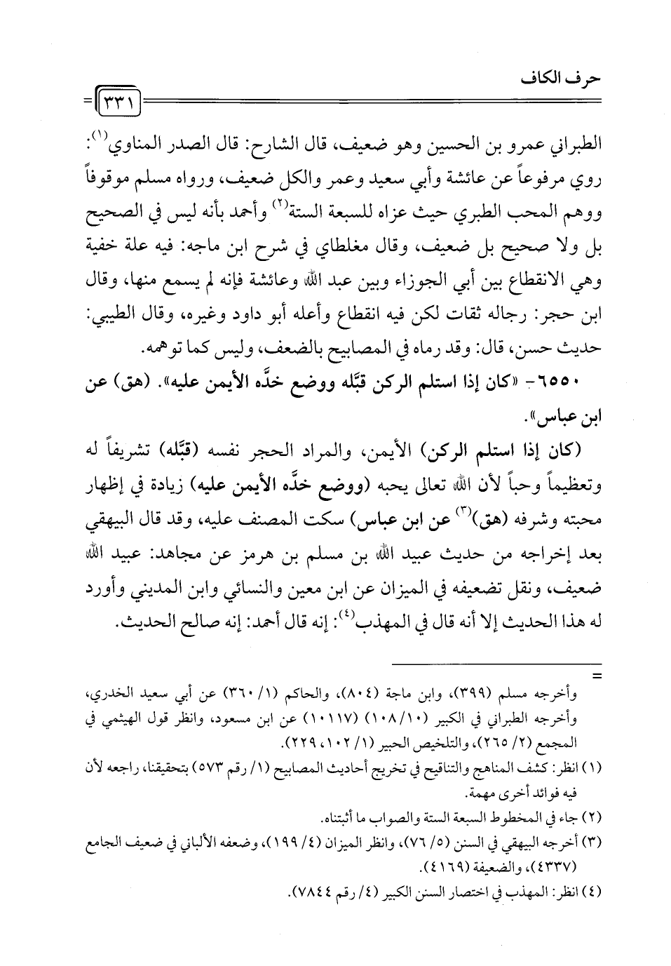 6550 - "كان إذا استلم الركن قبَّله ووضع خدَّه الأيمن عليه". (هق) عن ابن عباس".