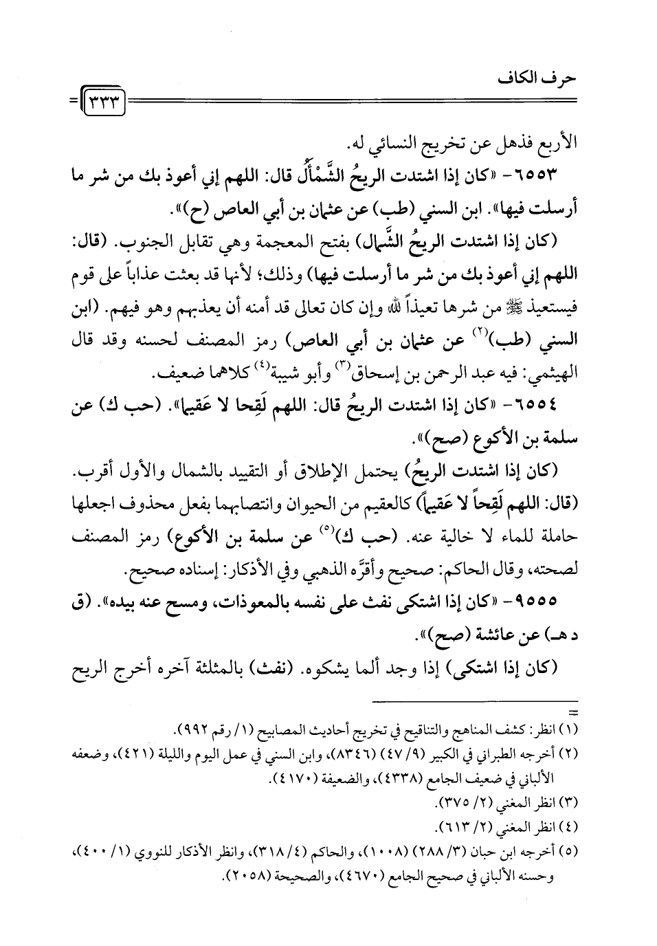 6553 - "كان إذا اشتدت الريحُ الشَّمْأَل قال: اللهم إني أعوذ بك من شر ما أرسلت فيها". ابن السني (طب) عن عثمان بن أبي العاص (ح) ".