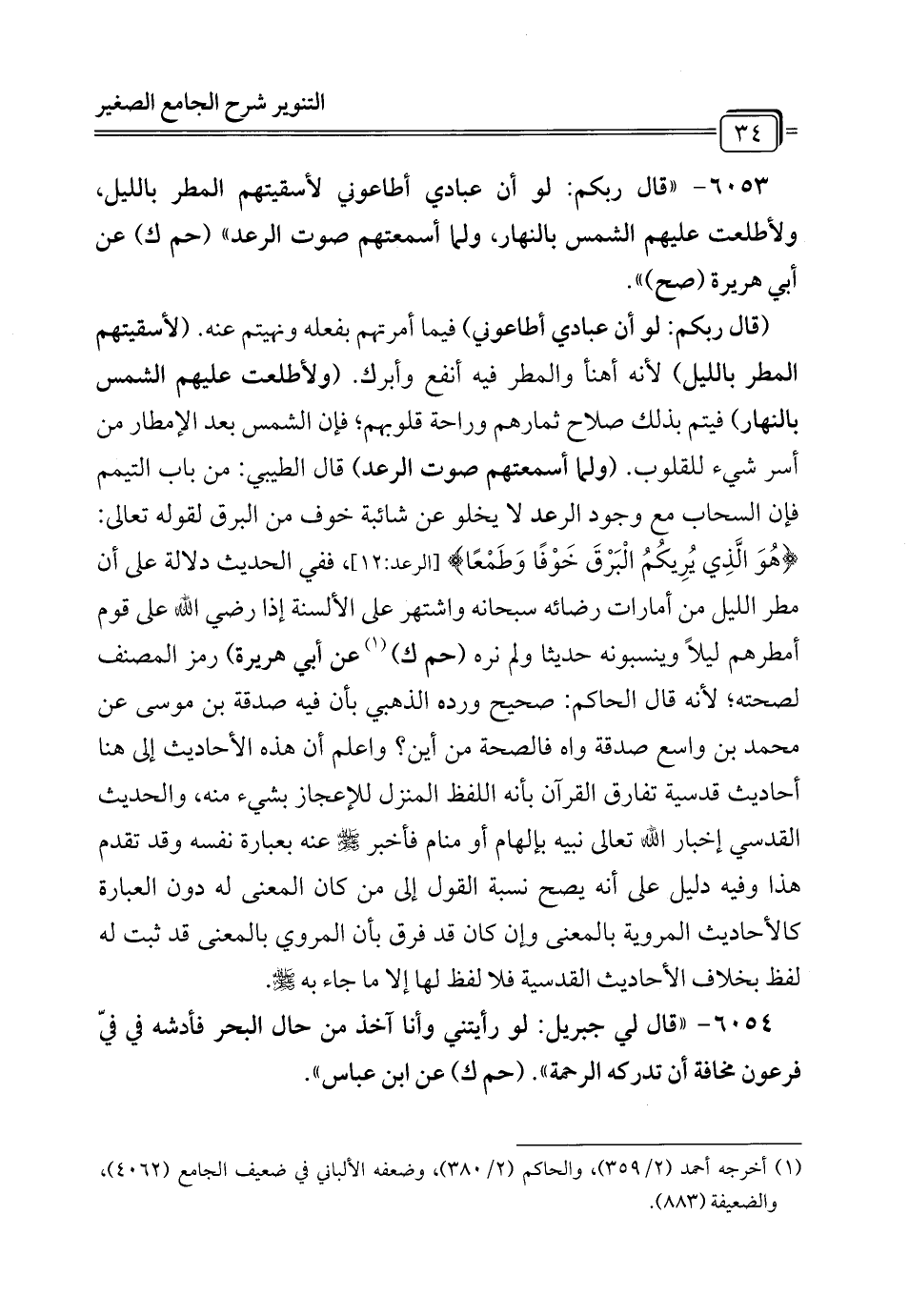 6053 - "قال ربكم: لو أن عبادي أطاعوني لأسقيتهم المطر بالليل، ولأطلعت عليهم الشمس بالنهار، ولما أسمعتهم صوت الرعد" (حم ك) عن أبي هريرة (صح) ".