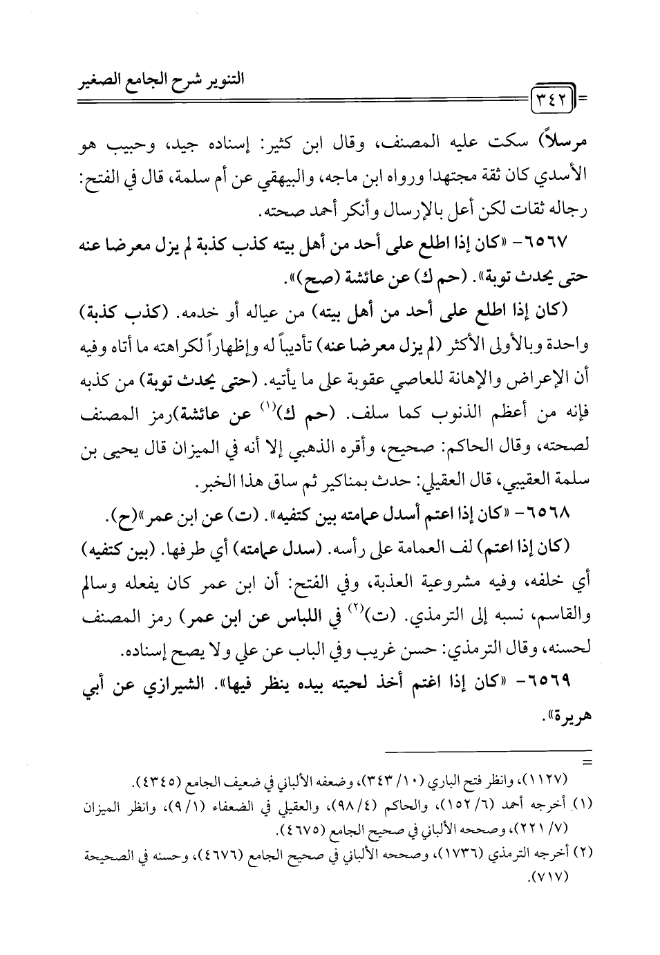 6568 - "كان إذا اعتم أسدل عمامته بين كتفيه". (ت) عن ابن عمر" (ح).