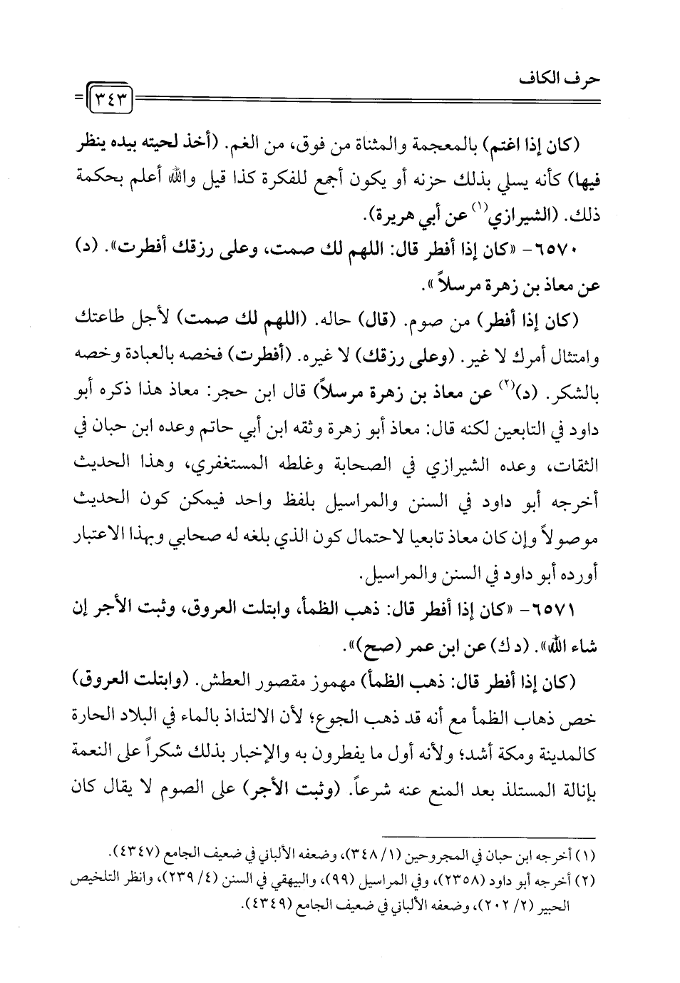 6570 - "كان إذا أفطر قال: اللهم لك صمت، وعلى رزقك أفطرت". (د) عن معاذ بن زهرة مرسلاً".