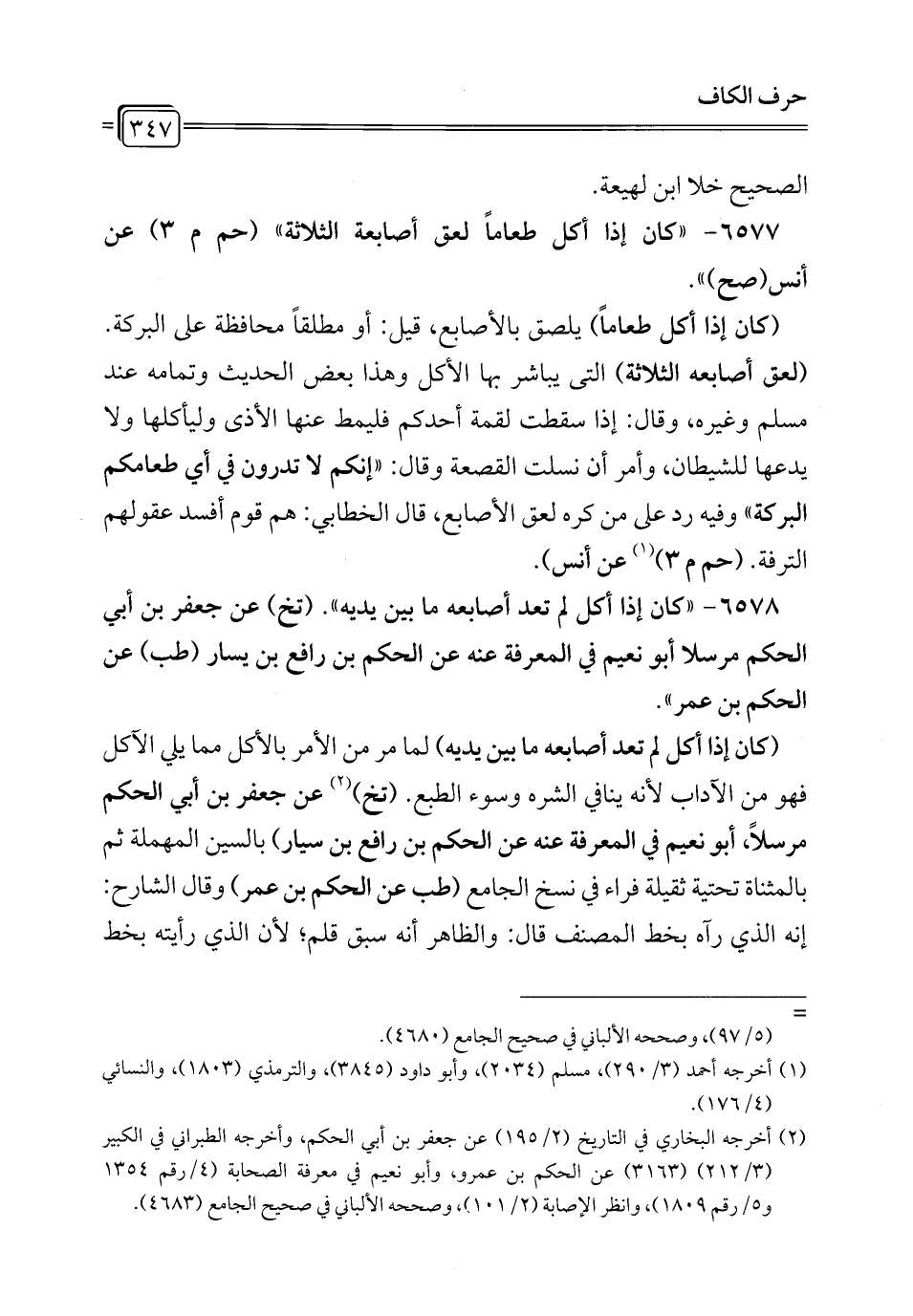6577 - "كان إذا أكل طعاماً لعق أصابعة الثلاثة" (حم م 3) عن أنس (صح) ".