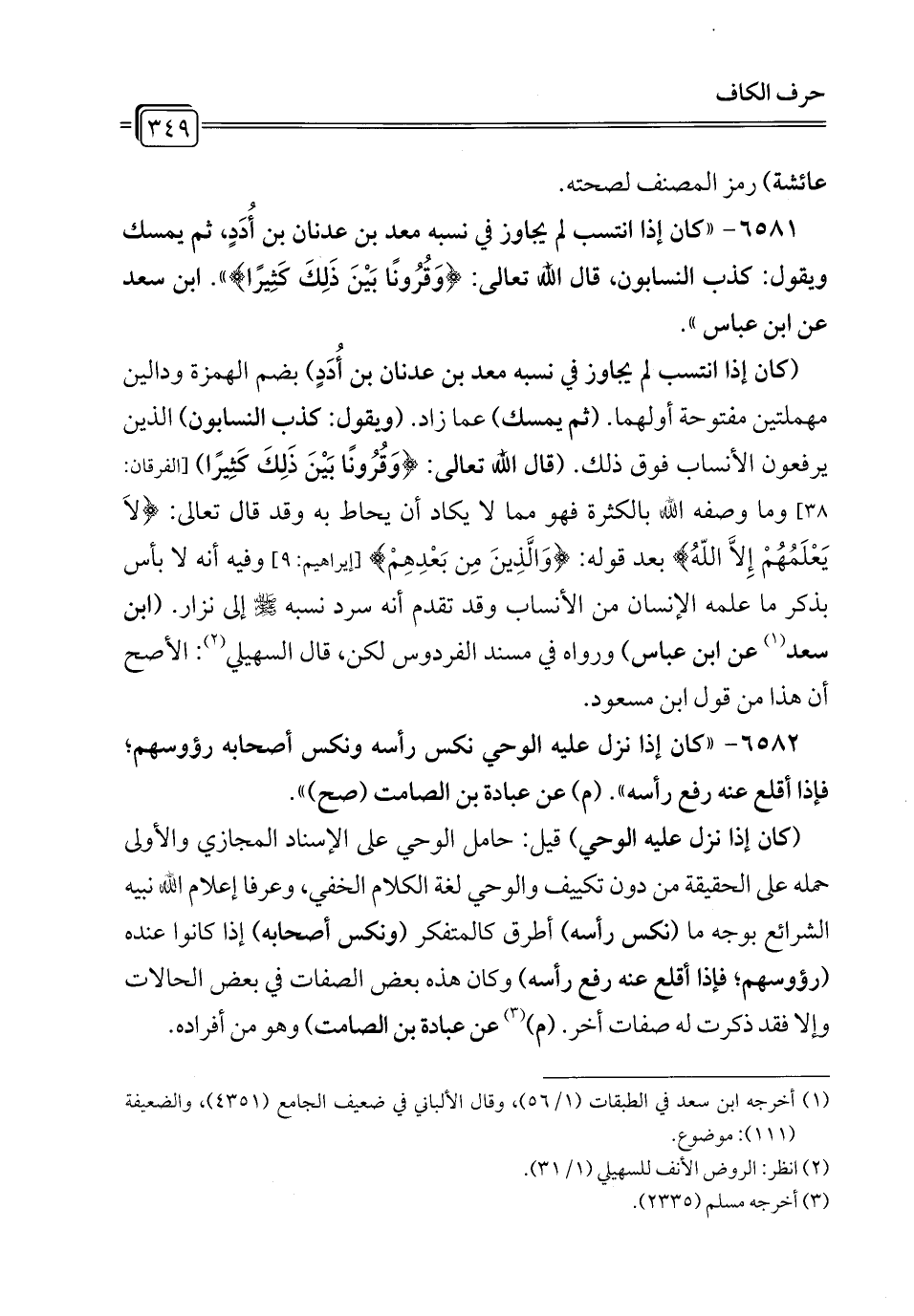 6581 - "كان إذا انتسب لم يجاوز في نسبه معد بن عدنان بن أُدَدٍ، ثم يمسك ويقول: كذب النسابون، قال الله تعالى {وَقُرُونًا بَيْنَ ذَلِكَ كَثِيرًا} ". ابن سعد عن ابن عباس".