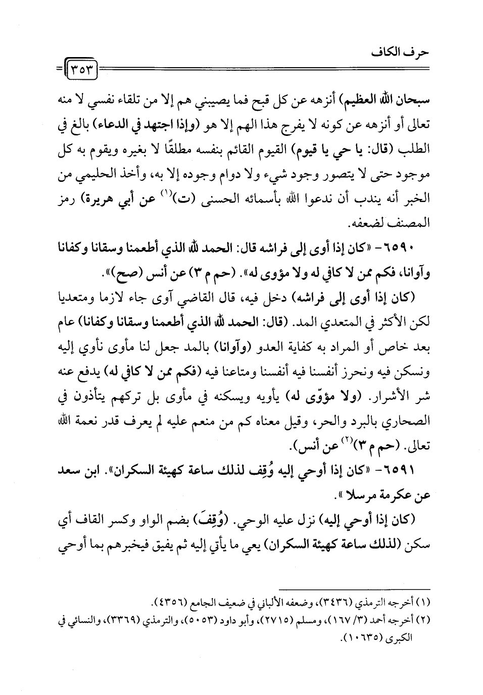 6590 - "كان إذا أوى إلى فراشه قال: الحمد لله الذي أطعمنا وسقانا وكفانا وآوانا، فكم ممن لا كافي له ولا مؤوى له". (حم م 3) عن أنس (صح) ".